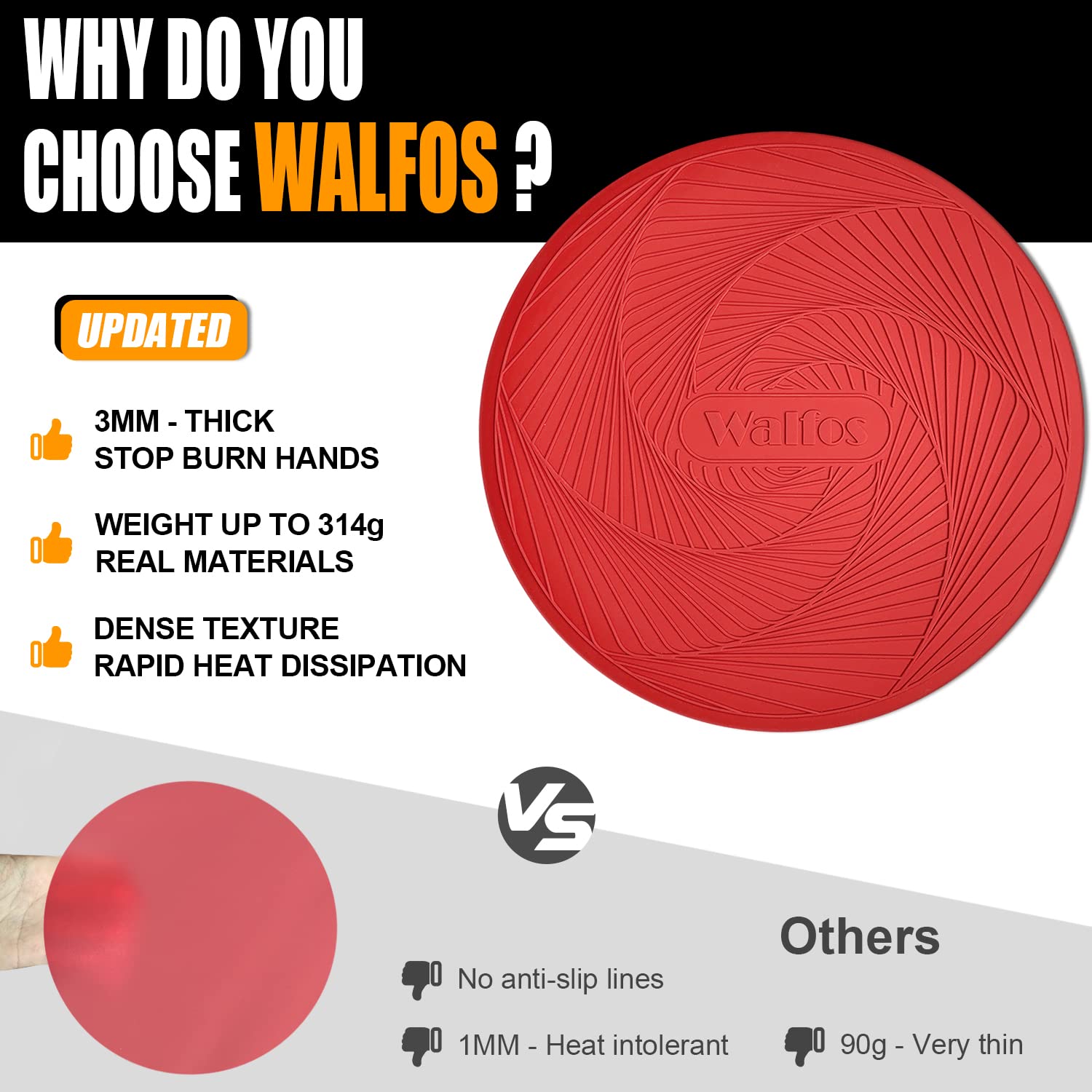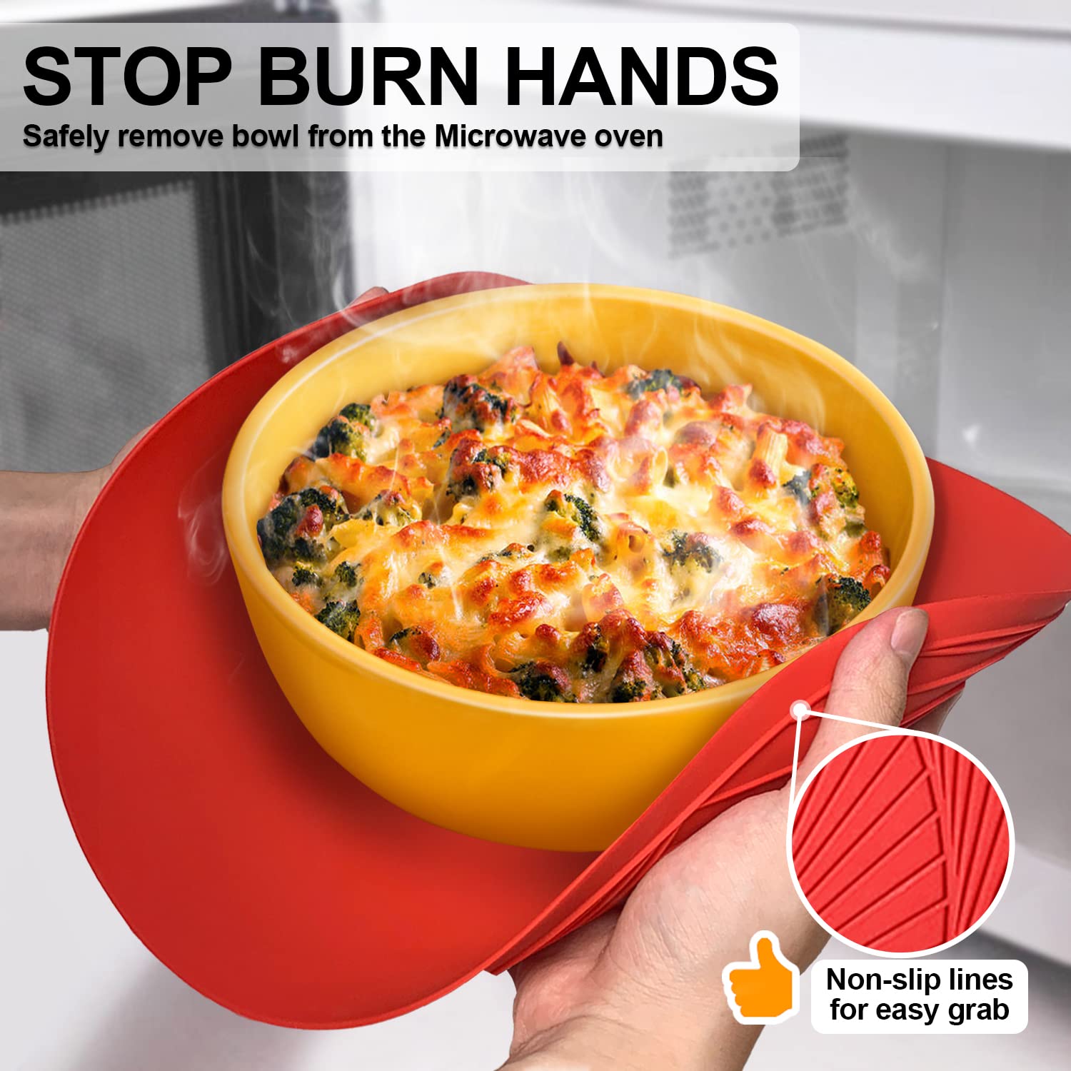 UNIQUE NON-SLIP TEXTURE & THICKENED DESIGN: Walfos's microwave mat silicone round has a unique Anti-slip Texture and it is thicker, which is better than other smooth and thin silicone microwave pad in terms of anti-slip and heat resistance. The raised edge helps to easily lift out hot bowls and make your hands safe from the heat while pick up the hot food