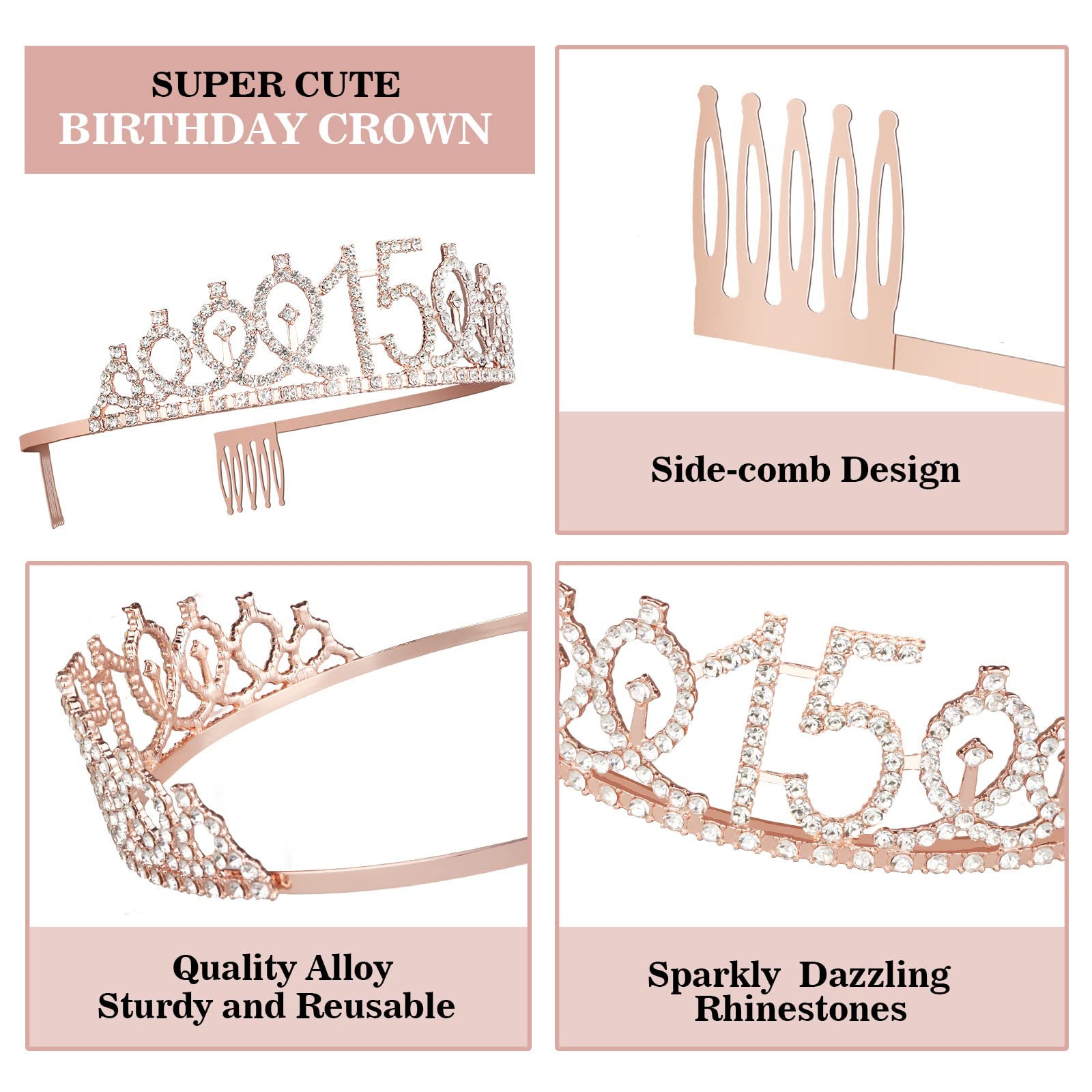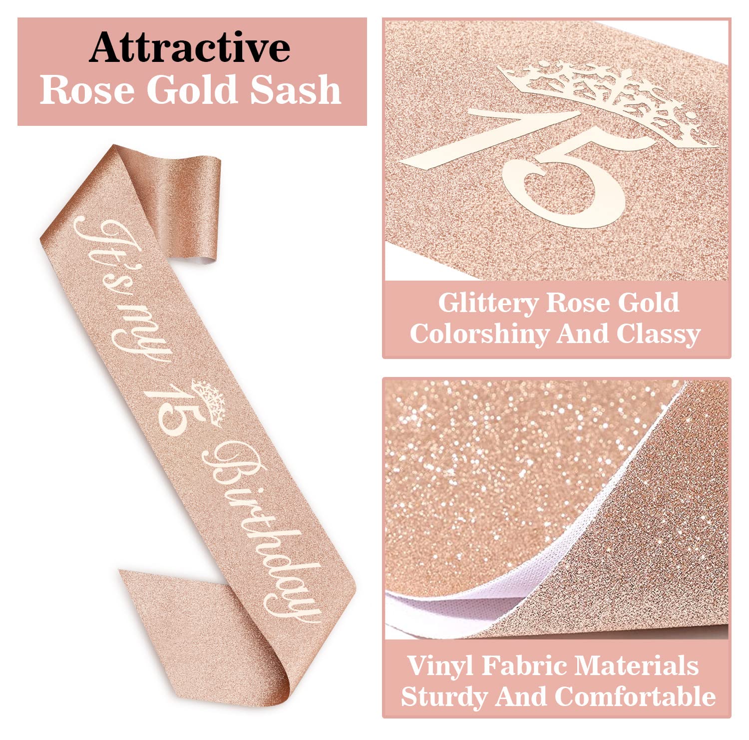 【Rose Gold Birthday Sash for Girls】: Our 15th Birthday Sash Is Made of High Quality Glitter Fabric with Foil Lettering . The Sash is in 63 inch Length and Comes With A Gold Charm Safety Pin that You Can Easily Adjust The Length You Need