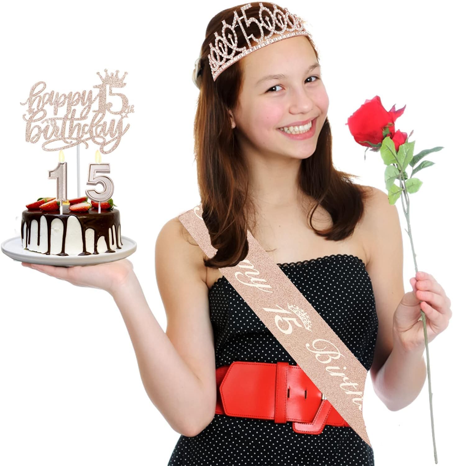 【15 Birthday Decorations for Girls】: Birthday Girls Sash *1pc, Birthday Girl Crown*1pc, Happy 15th Birthday Cake Topper *1pc, 1+5 Numeral Candles *1set. All be packed in a beautiful gift box ready for good presentation