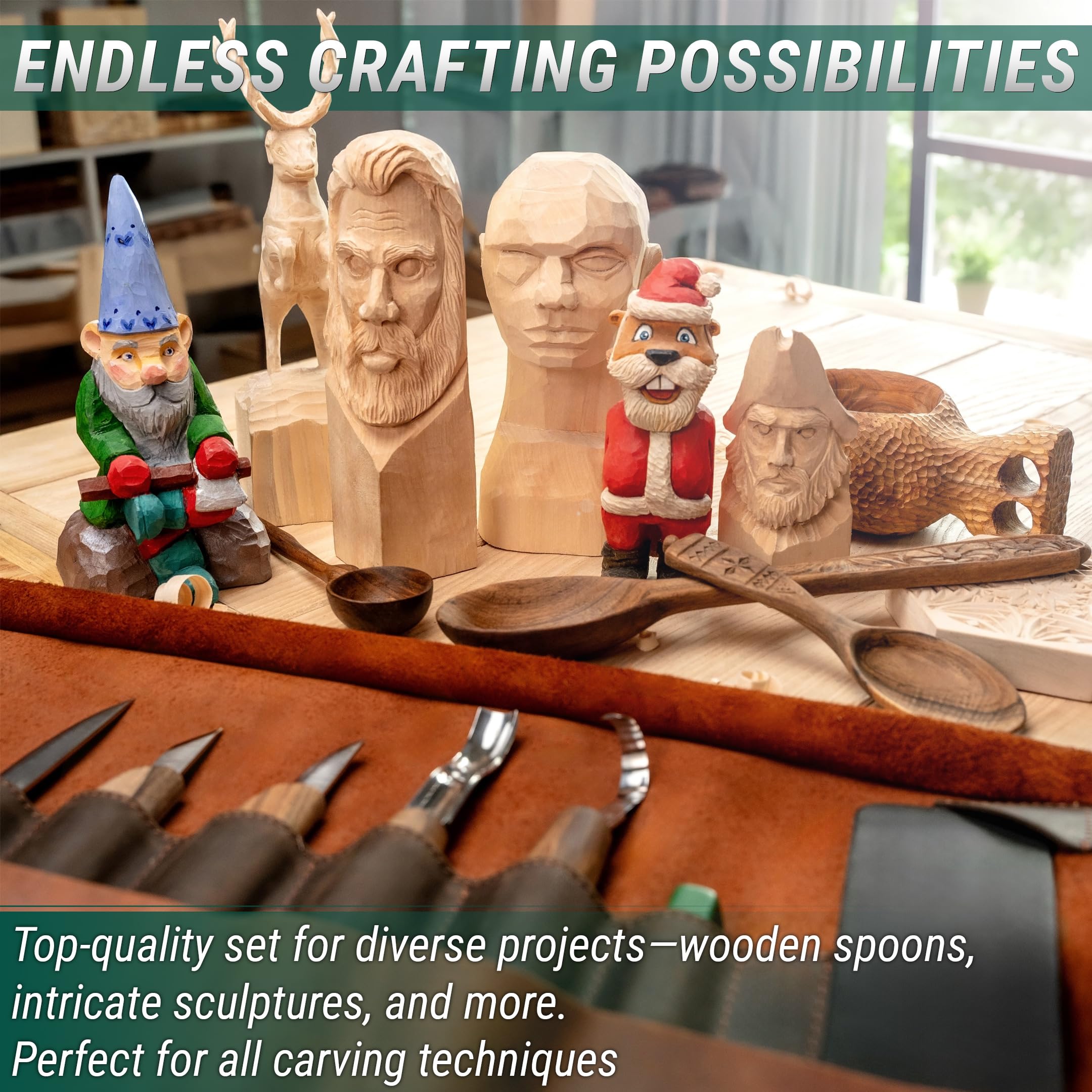 Whittling Tools in a Genuine Leather Pouch: Keep your whittling tools safe and organized in this genuine leather pouch that will look amazing in your workshop and bring you pleasure with one touch.
