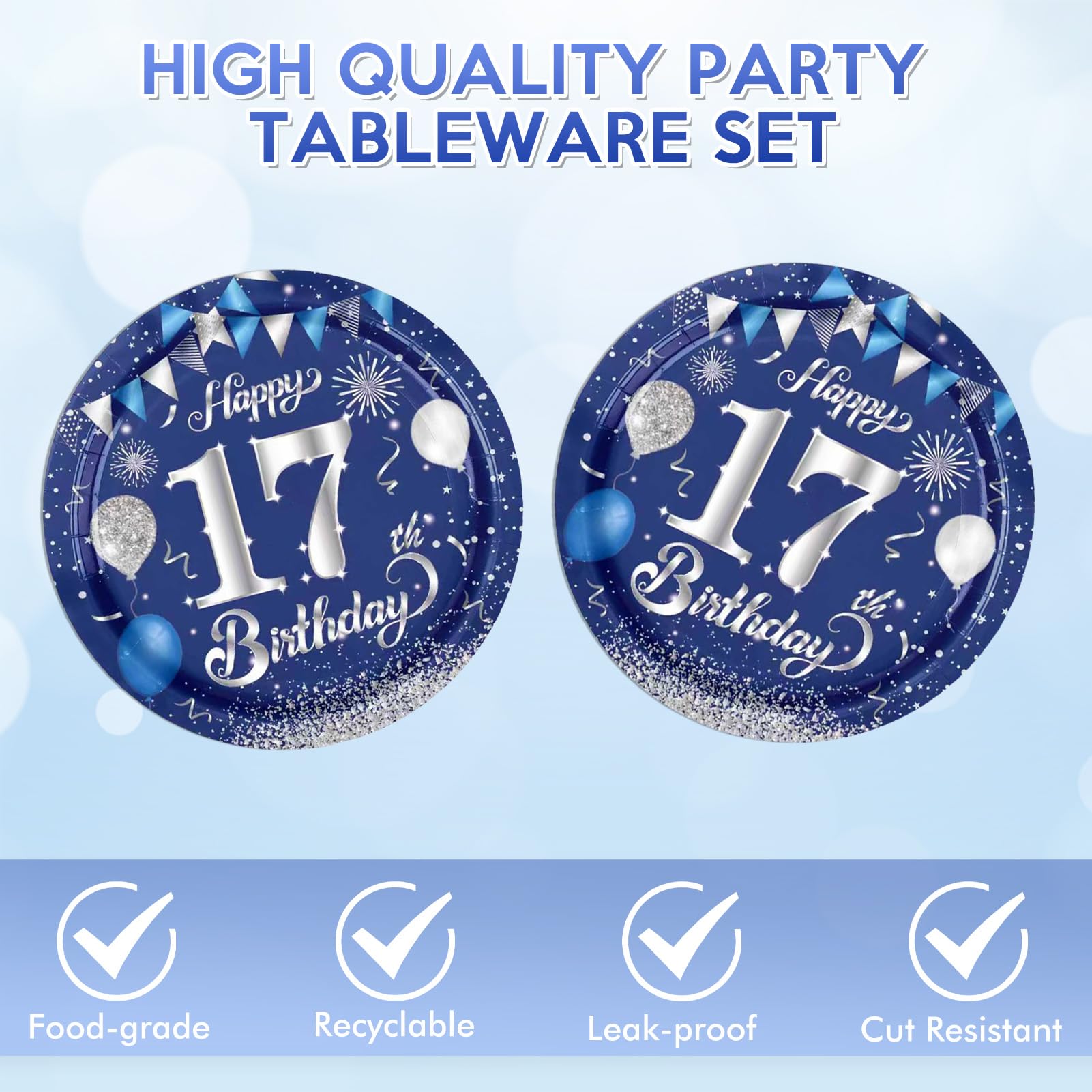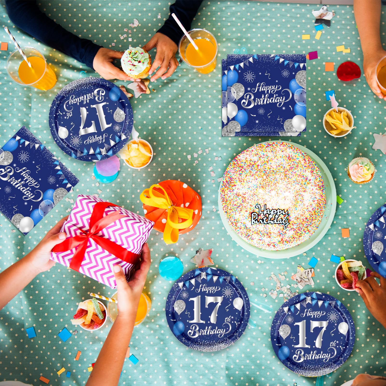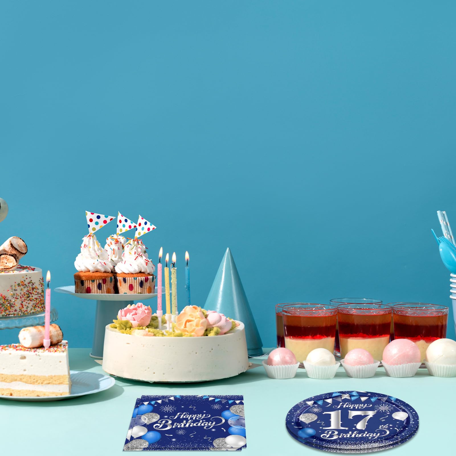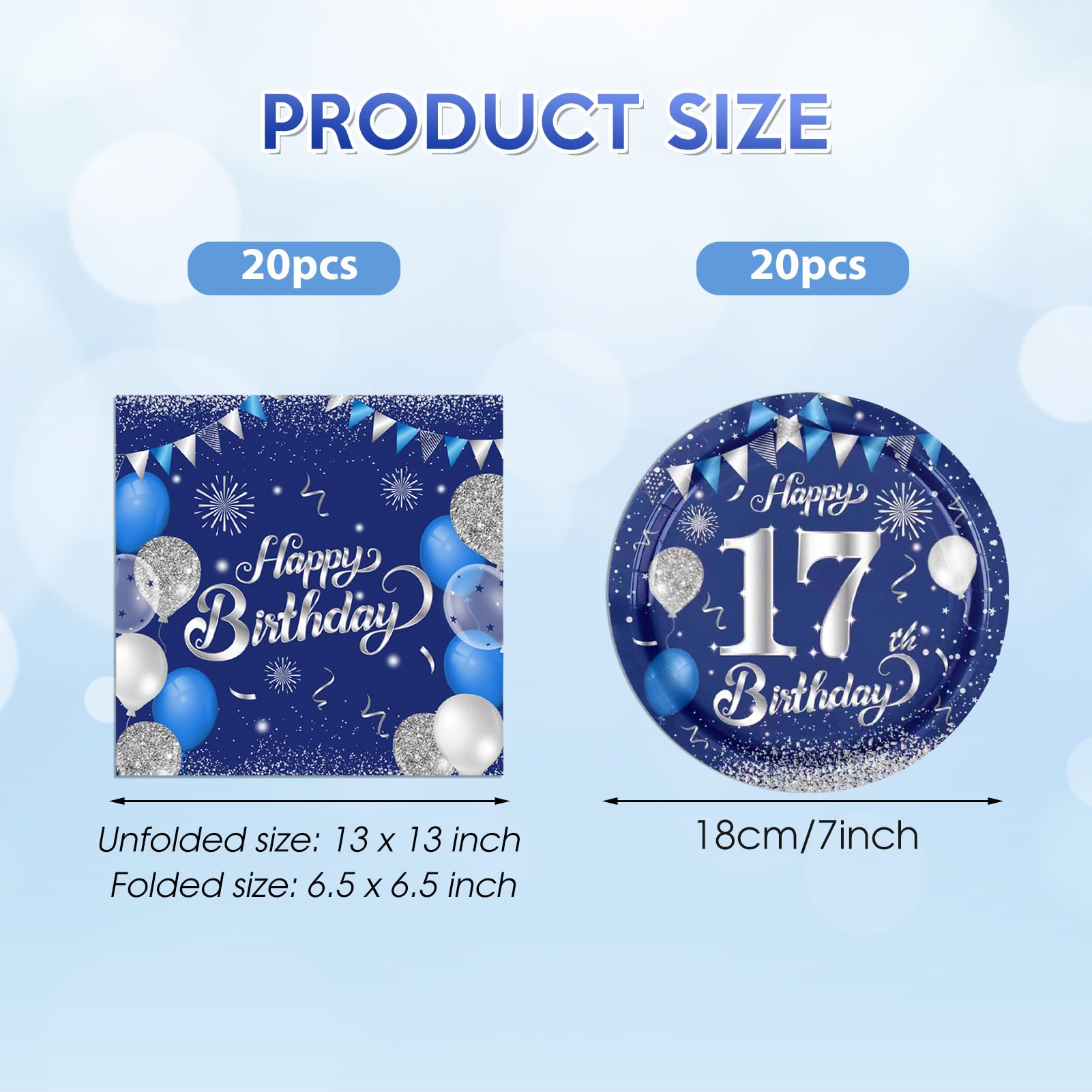 đăPremium Materială : 17th happy birthday plates and napkins set are made of food grade material, non-toxic and odorless. Advanced printing technology ensures that the patterns and colors are bright and long-lasting and will not fade. Create a warm atmosphere for your party,blue silver happy 17th birthday decorations will be unforgettable and impressive party decorations for you.
