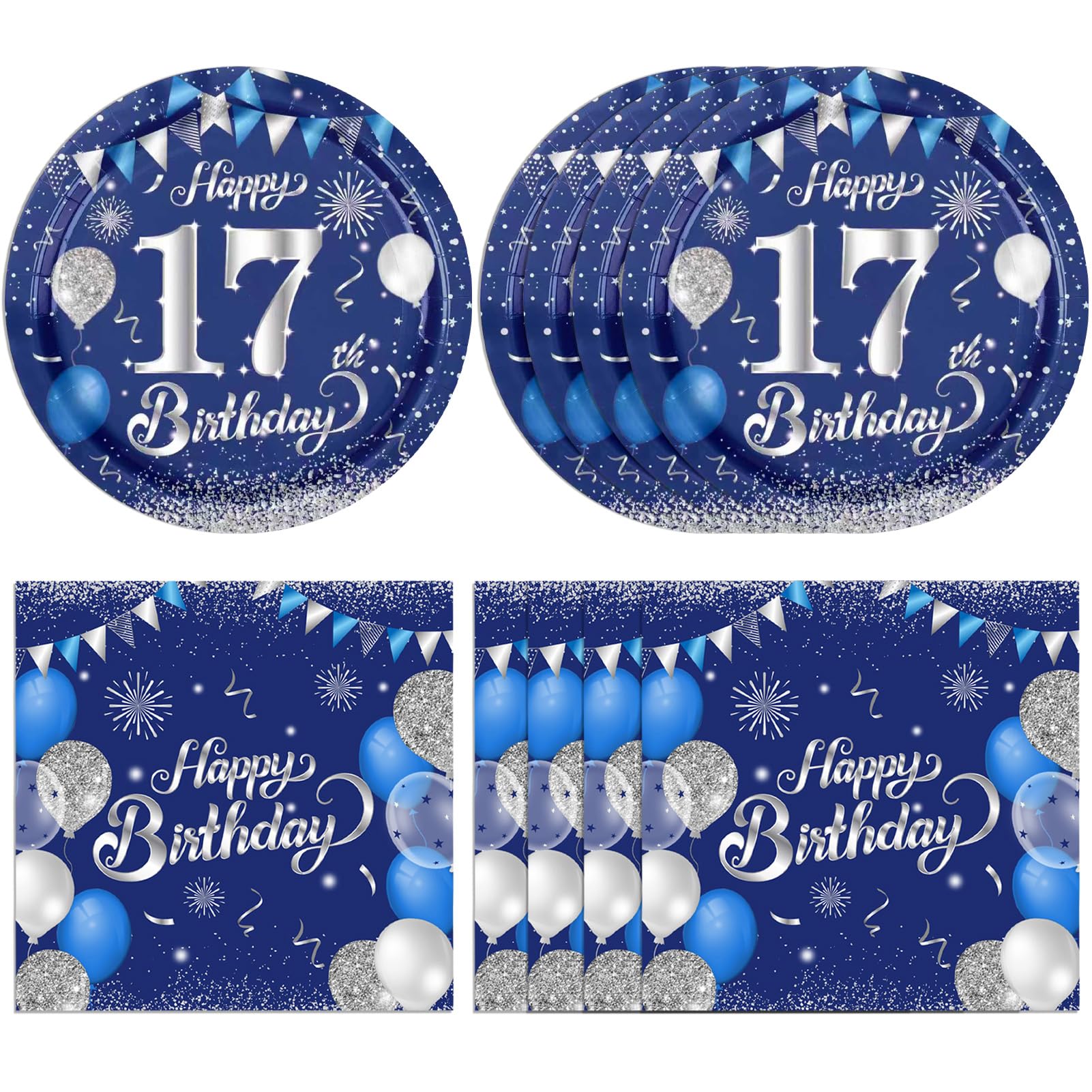 đă17 Birthday Decorations for Boys Kit ă: Celebrate the sweet 17th birthday with our elegant 17 birthday decorations, This set includes 20pcs 17th happy birthday plates and 20pcs birthday napkins, each set can serve 20 guests.The 17th theme birthday party decoration kit is enough to meet your decorating needs and easily create a strong birthday atmosphere in your home.