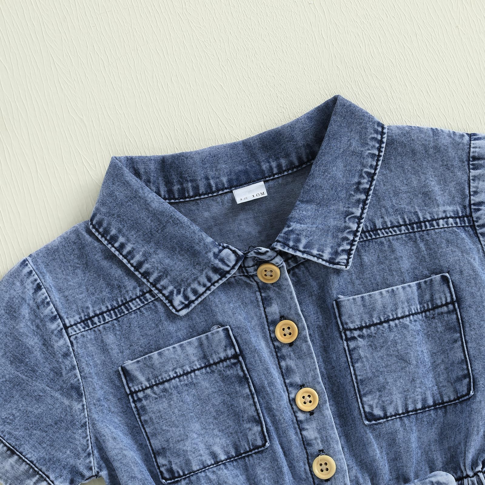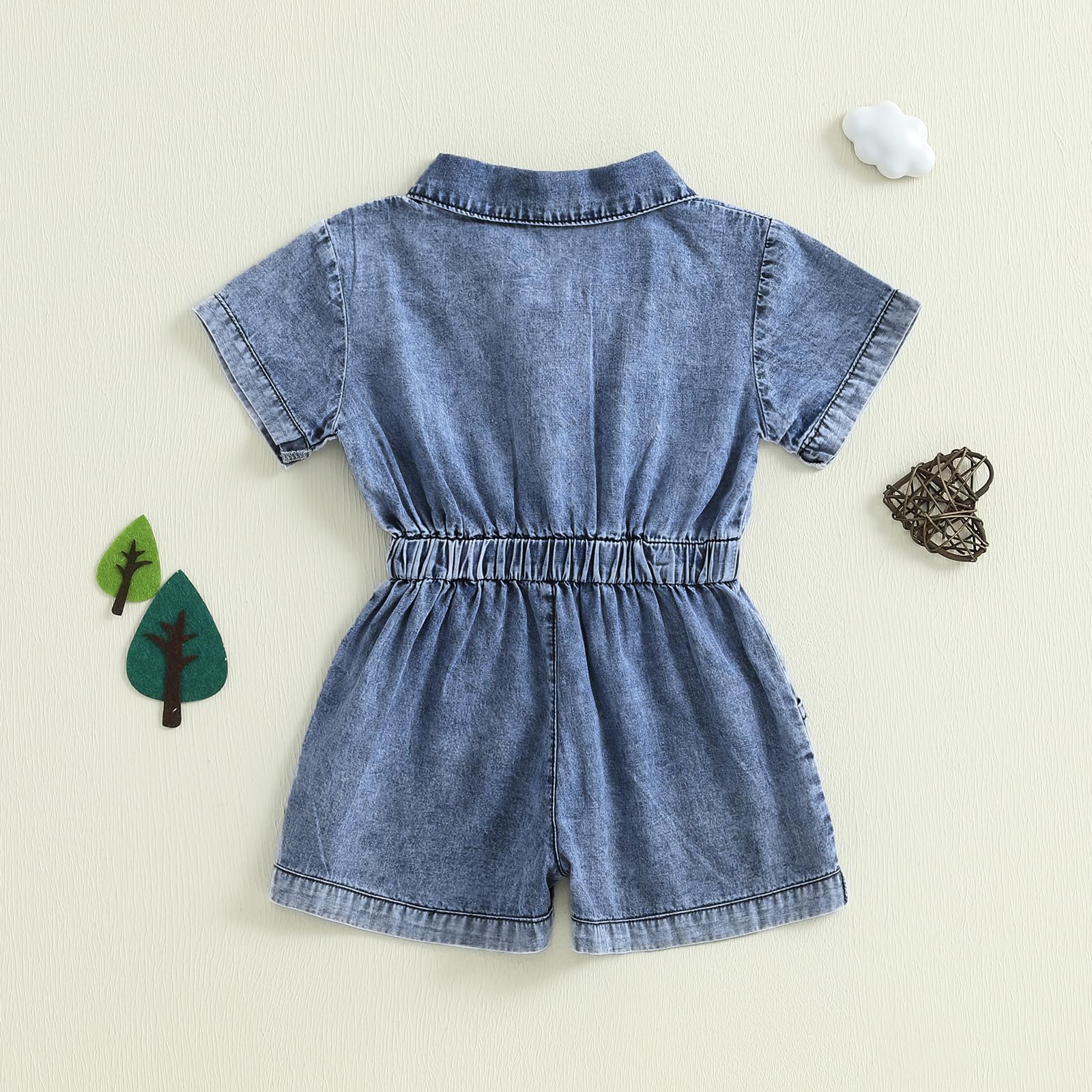 Features: Fashion toddler girl jumpsuit shorts, stylish little baby girl jean romper, solid color toddler girl short sleeves lapel elastic waist romper, front button down design, pockets detail; The easy-to-wear design makes dressing your child a breeze