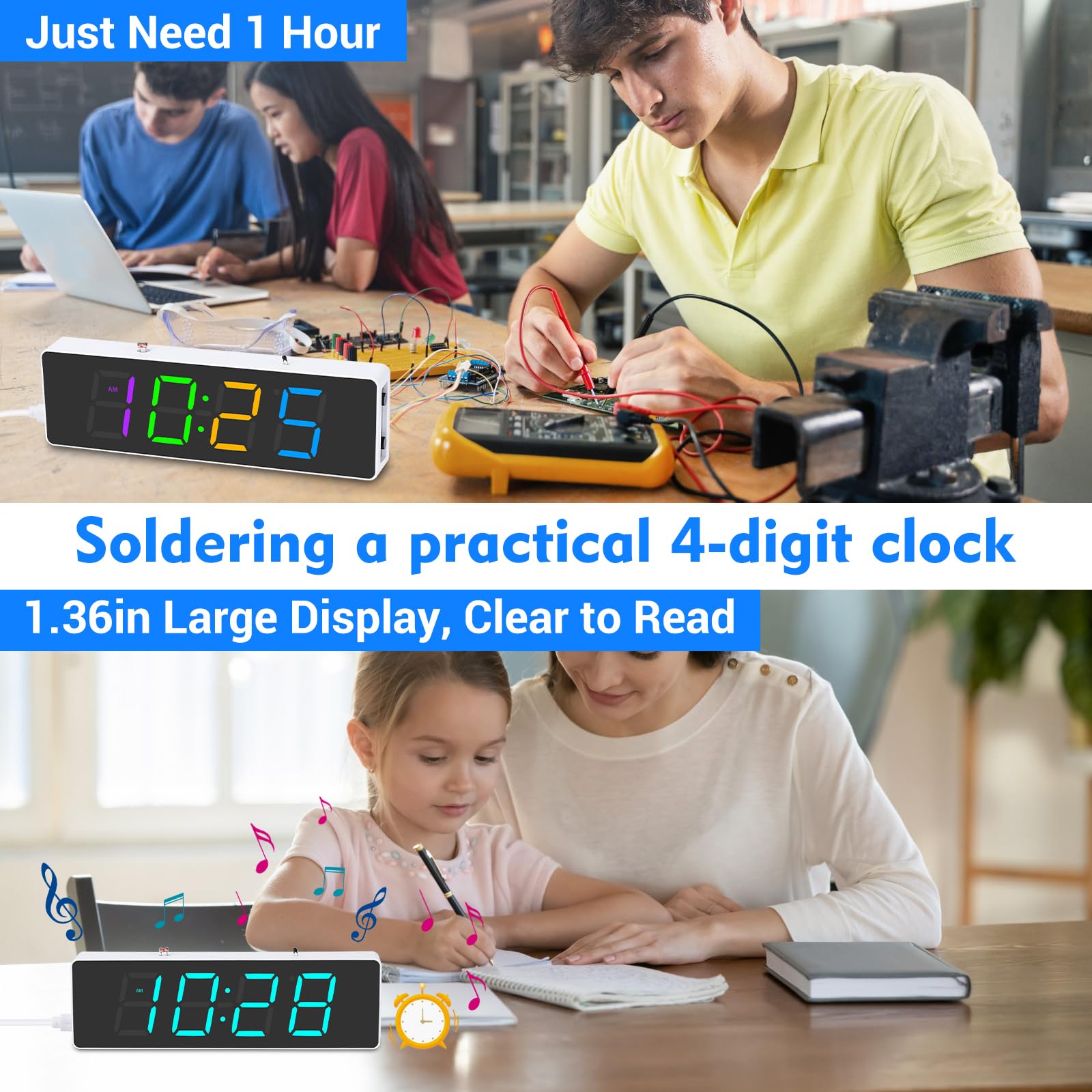 ⏰【DIY Digital Clock Kit】: The practical soldering kit are used to installed to a 4-Digit colorful LED Electronic Clock. Which can display current date, time, temperature in the real time, Alarm clock music. Electronic soldering project kit is not only to improve your soldering skills, you will also will be more familiar with electronic components and learn more interesting electronics things. The finished project can also be used as desktop art accessories.