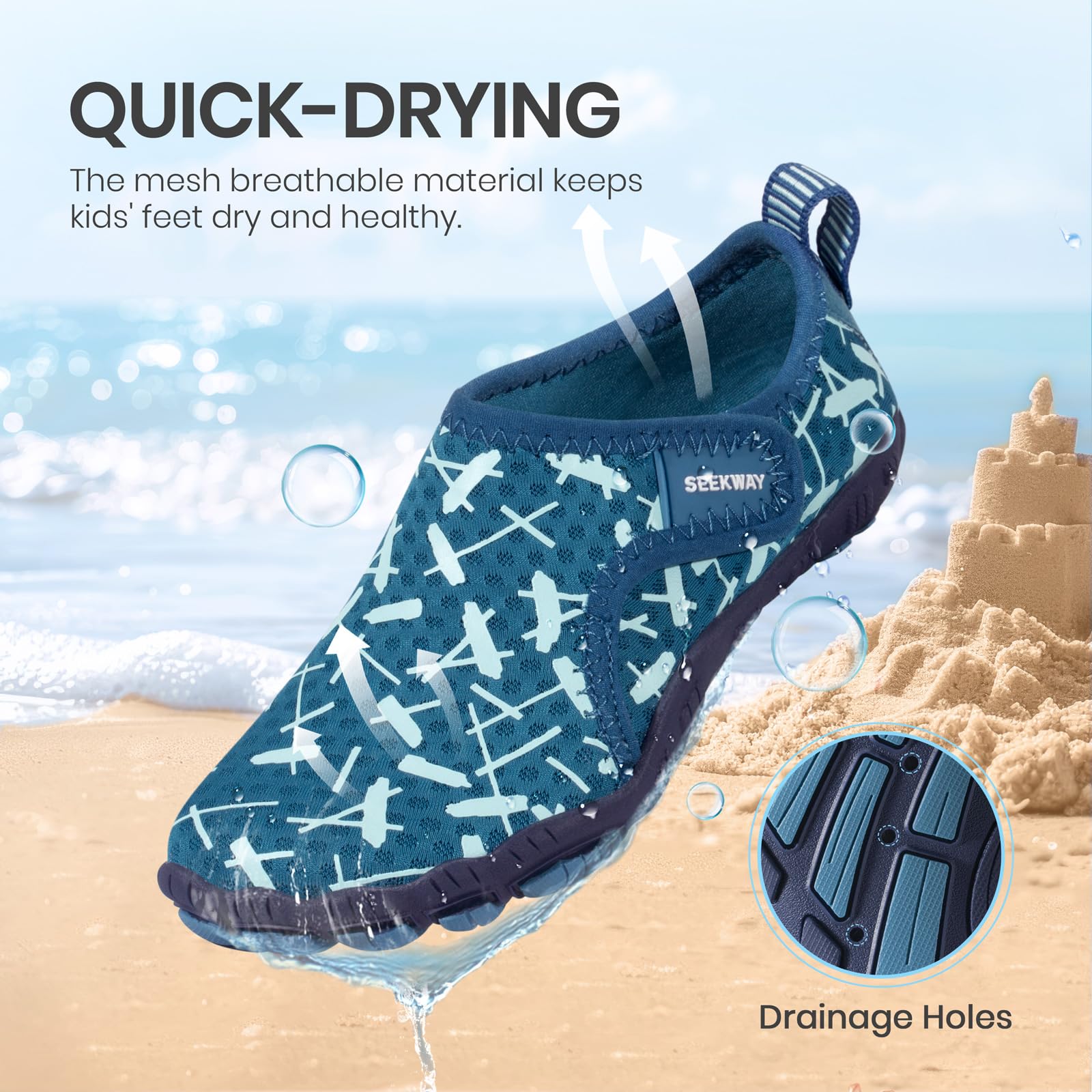 【Breathable & Permeable Material】: The mesh breathable material on the upper combined with drainage holes on the outsole keeps kids' feet dry and healthy.