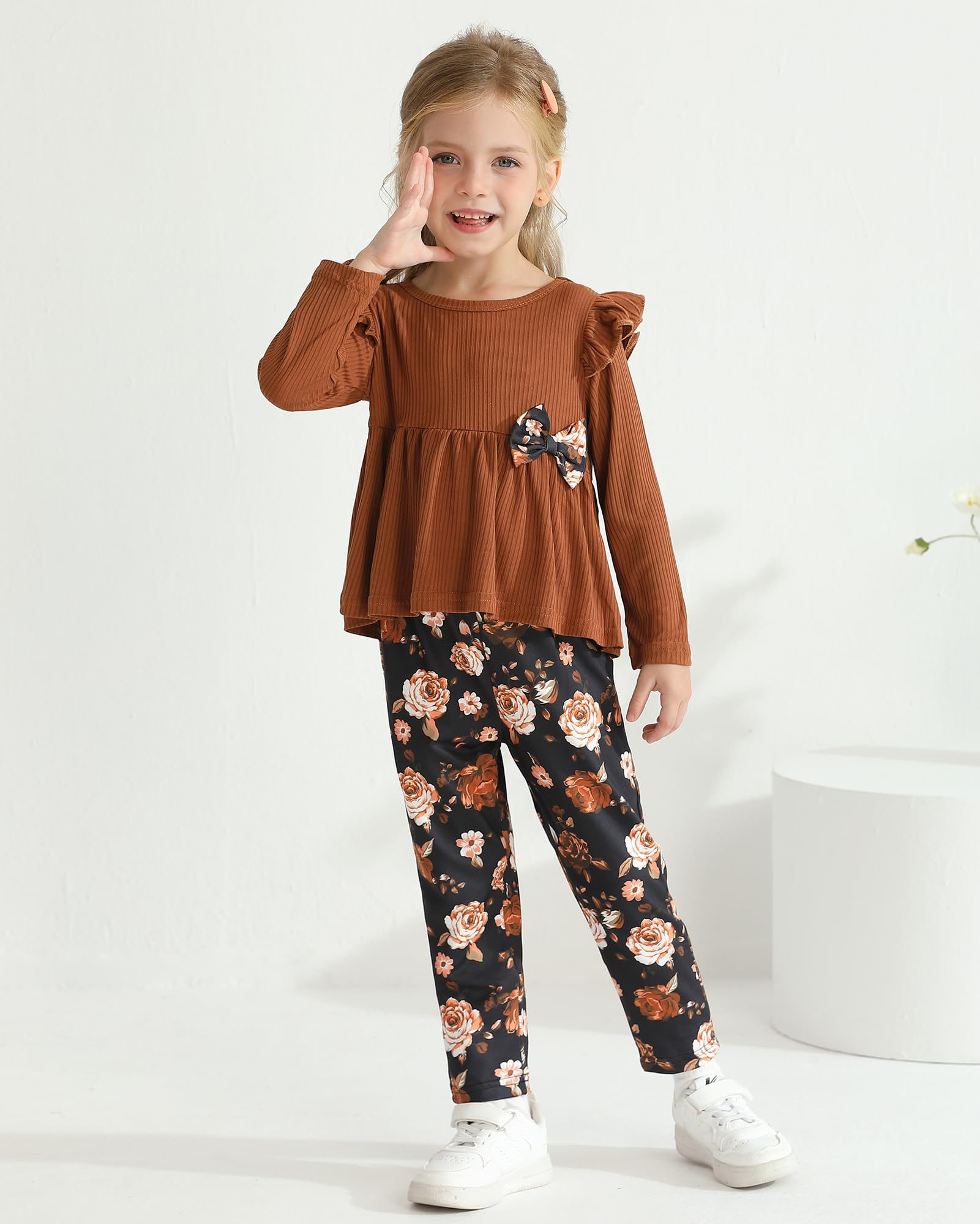Description The Toddler Girl Outfits offers comfort and style with a solid color ruffle shirt and floral pants.It's perfect for fall, featuring soft,breathable fabric that's gentle on toddler skin. The little kids outfit is both casual and chic,making it ideal for daily wear or special occasions.
