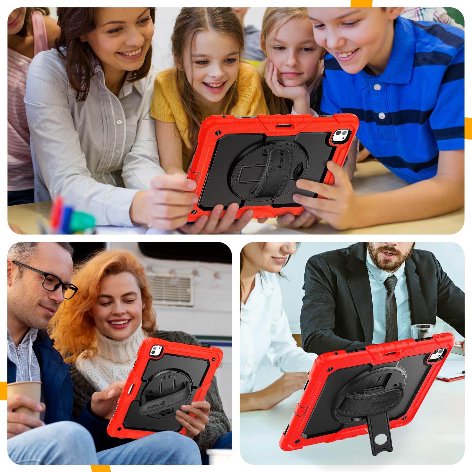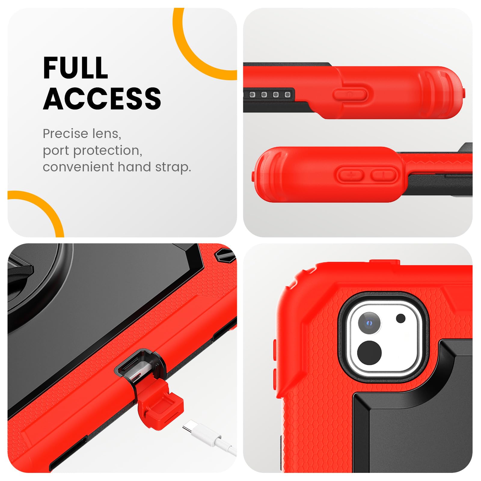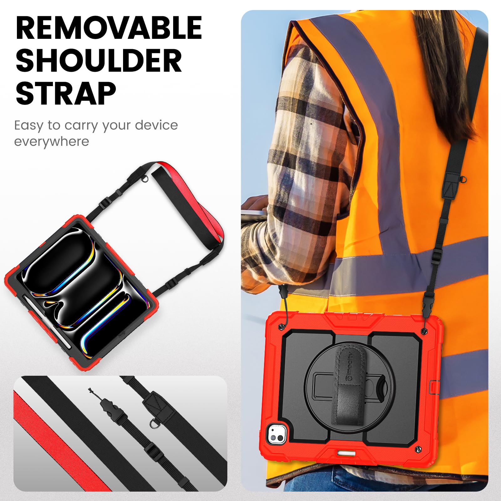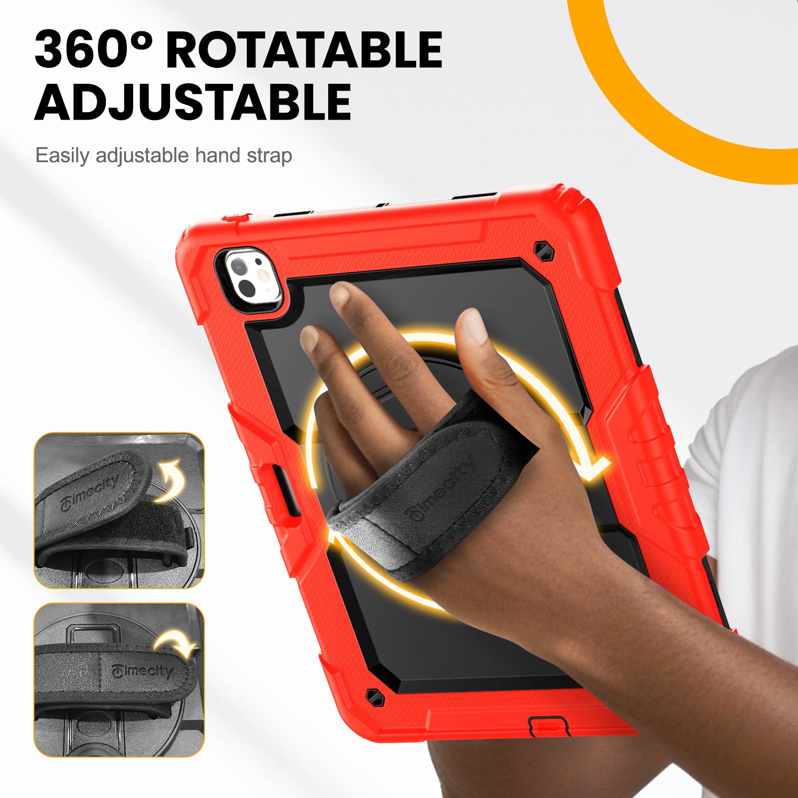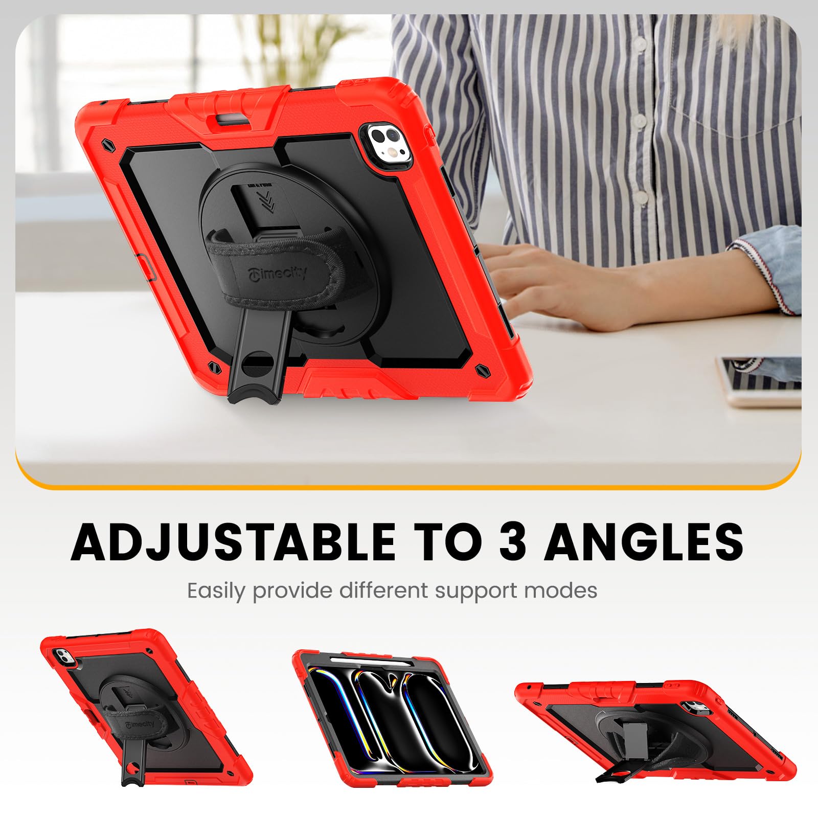 MULTI-ANGLE FUNCTIONALITY: 360° rotating stand with 5 positions for video calls, notes, or viewing; Detachable shoulder strap for commutes; Anti-slip hand strap secures during outdoor work; Dedicated pencil holder for hiking/transport