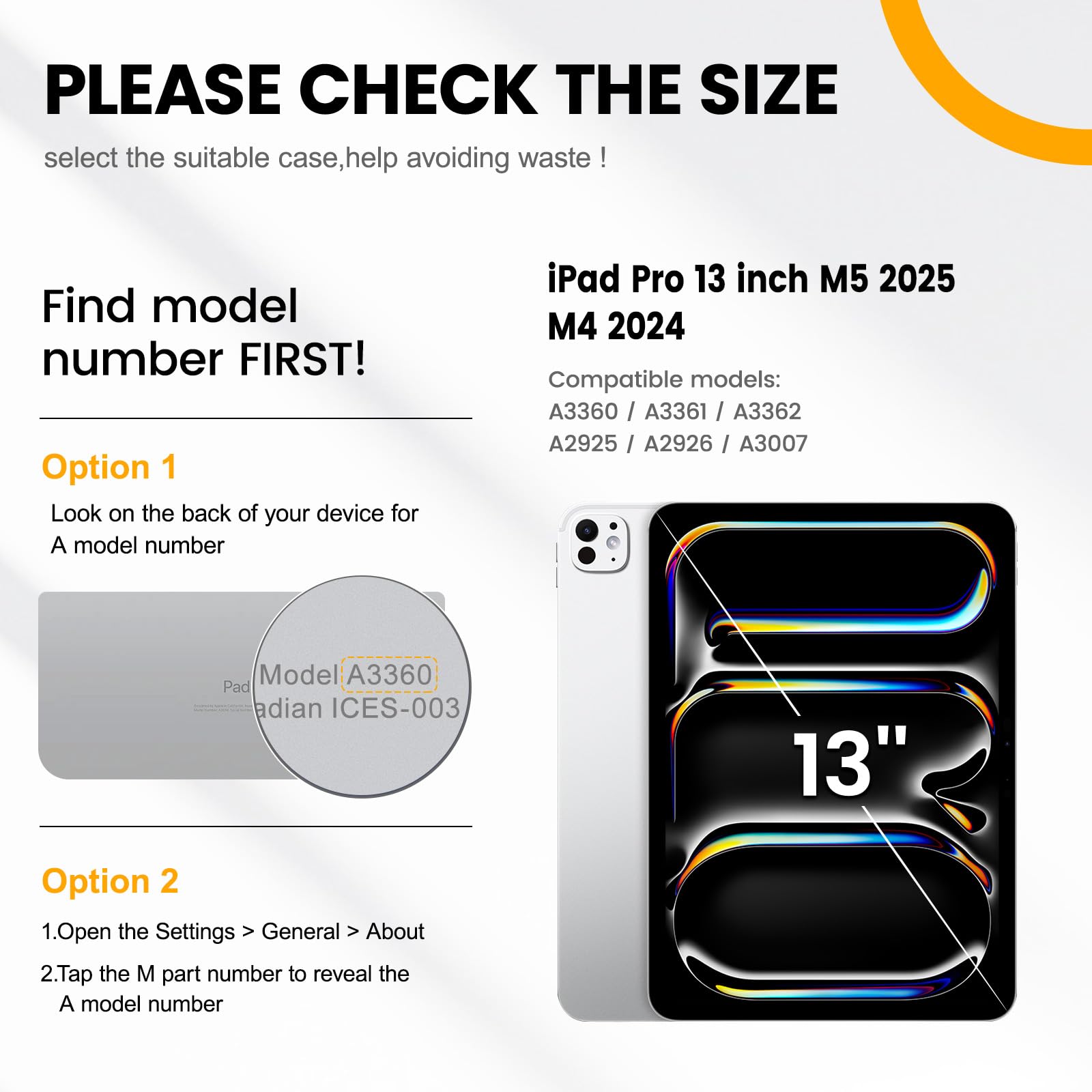 MODEL SPECIFICATIONS: Designed for iPad Pro 13-inch M5 2025 (A3360/ A3361/ A3362)/ M4 2024 (A2925/ A2926/ A3007); Confirm compatibility under Settings > General > Model; Excludes iPad Air/Mini