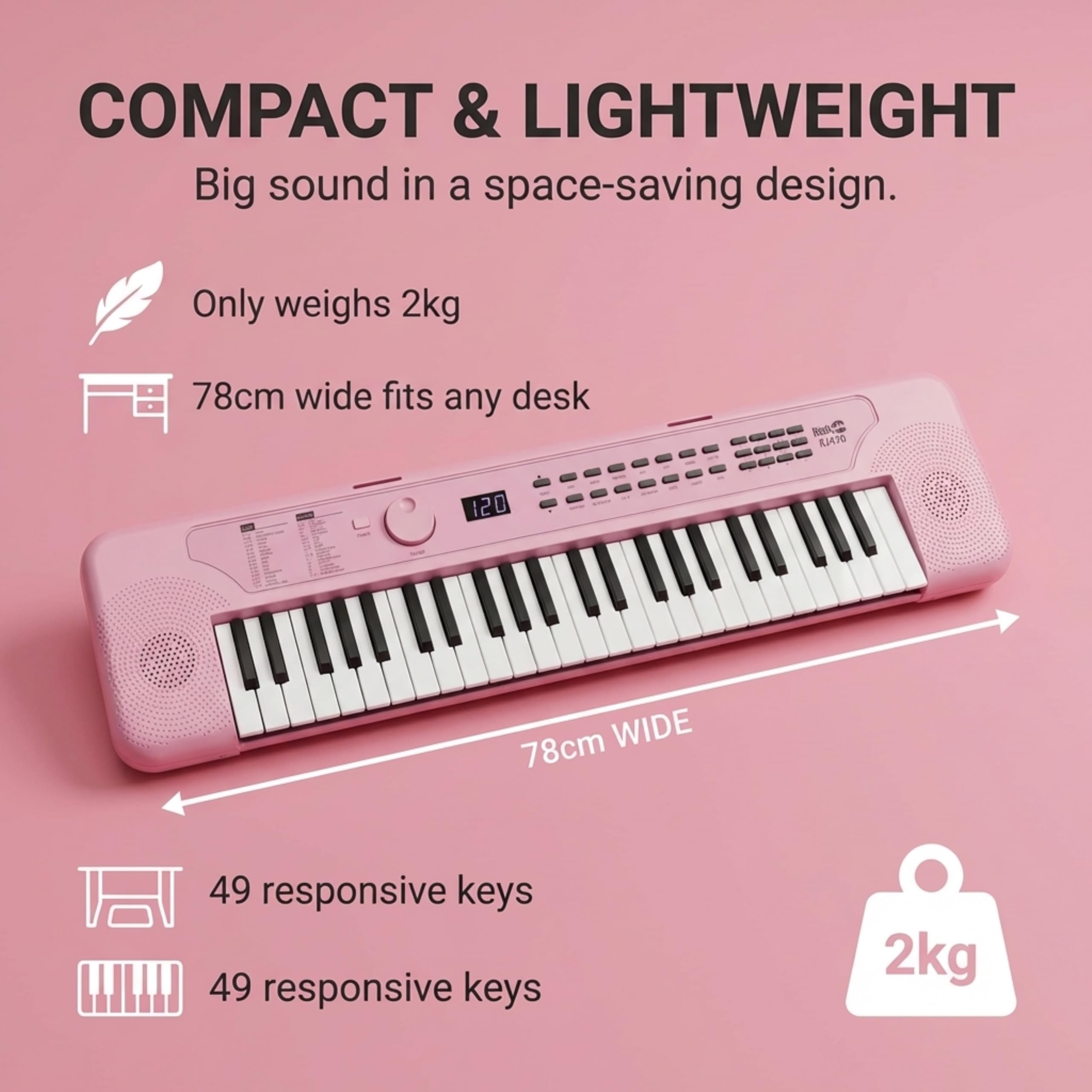 Compact 49-Key Keyboard Piano Portable electronic keyboard with 49 responsive keys in a compact design that fits easily into home practice spaces. Lightweight construction makes it easy to move, store and set up wherever you want to play.