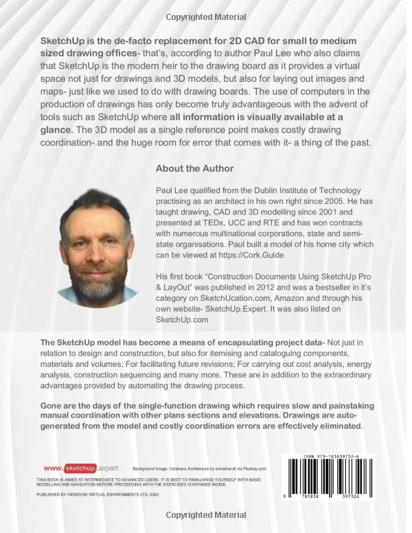 Construction Documents Using SketchUp Pro Updated (2024) is a detailed step-by-step guide to building a house model from scratch and creating finished construction documents. This super easy-to-follow course contains tips and tricks to export fully finished Plan/Sections/Elevations and Details. Each page explains in detail the steps to complete a task. This course was designed with busy architects and constructors in mind. It was formulated from years of experience using SketchUp in practise and also from teaching professionals from many different backgrounds. Written by an experienced architect who has used SketchUp to design and project-manage many types of jobs from dwellings to commercial office buildings to urban development, it has been shaped by extensive practise of design and build. Note: The previous version of this publication (2020) was given a 4.1 Star Rating on Amazon with 20 reviews: https://www.amazon.com/Construction-Documents-Using-SketchUp-2020/dp/1527256405 This book contains some of the best professional workflows you'll find anywhere. SketchUp's tools and settings are best understood in the context of a "live" project. In this book, the chosen topic is a renovation-extension of an existing dwelling that was successfully completed by the author in 2011. The book clearly illustrates all the steps required to construct the walls, windows, doors and roofs in a professional manner using best-practise procedures. Groups and Components are structured in the simplest and most effective way to achieve beautifully presented construction documents. Each concept is clearly documented: Groups, Section Cuts, Styles, Scenes (Plans, Sections, Elevations), Tags (Layers), and Perspective Views. Tools are introduced in sequence as you move from task to task. The reader gets a comprehensive understanding of how each works in practise. Every page is set out using crystal clear graphics which link the itemised steps to their image (visual) reference. The SketchUp model is built in a way that mimics real-life construction process: Walls are set out in 2D. The floor slab is elevated. Walls are elevated. Windows and doors are placed inside the wall structure. Internal walls are constructed Internal doors are inserted. The roof is created complete with rooflights. Component Libraries are an essential part of SketchUp modelling. Learning how to name, create and manage Libraries boosts ability to rapidly populate models with doors, windows, tables, chairs, people and cars. Section Cuts enable you to slice through your model and create your plans and sections. To complete your SketchUp modelling session you learn how to manage materials and colours. SketchUp Pro's graphics interface- known as "LayOut" has some very useful new features. Learn how to choose and set up Title Blocks, insert SketchUp Model Scenes and create dimensions, text and graphics. This book also covers LayOut's 2D scaled drawing functionality. Scrapbook is a graphics library within LayOut which contains all kinds of pre-loaded and customised material. Scrapbook's drag-and-drop interface is a powerful means to quickly complete drawings and presentations. Each LayOut menu is explained in detail. The LayOut section of the book explains how to create a graphics library, along with recommended sizes for text, line weights and dimensions. Paul's five favourite shortcuts (keystrokes) reduce modelling time and significantly increase modeling performance. These are explained in detail. Creating your own bespoke shortcut keys is also covered. For those looking to upgrade their skills to the next level, this book is a must-read.