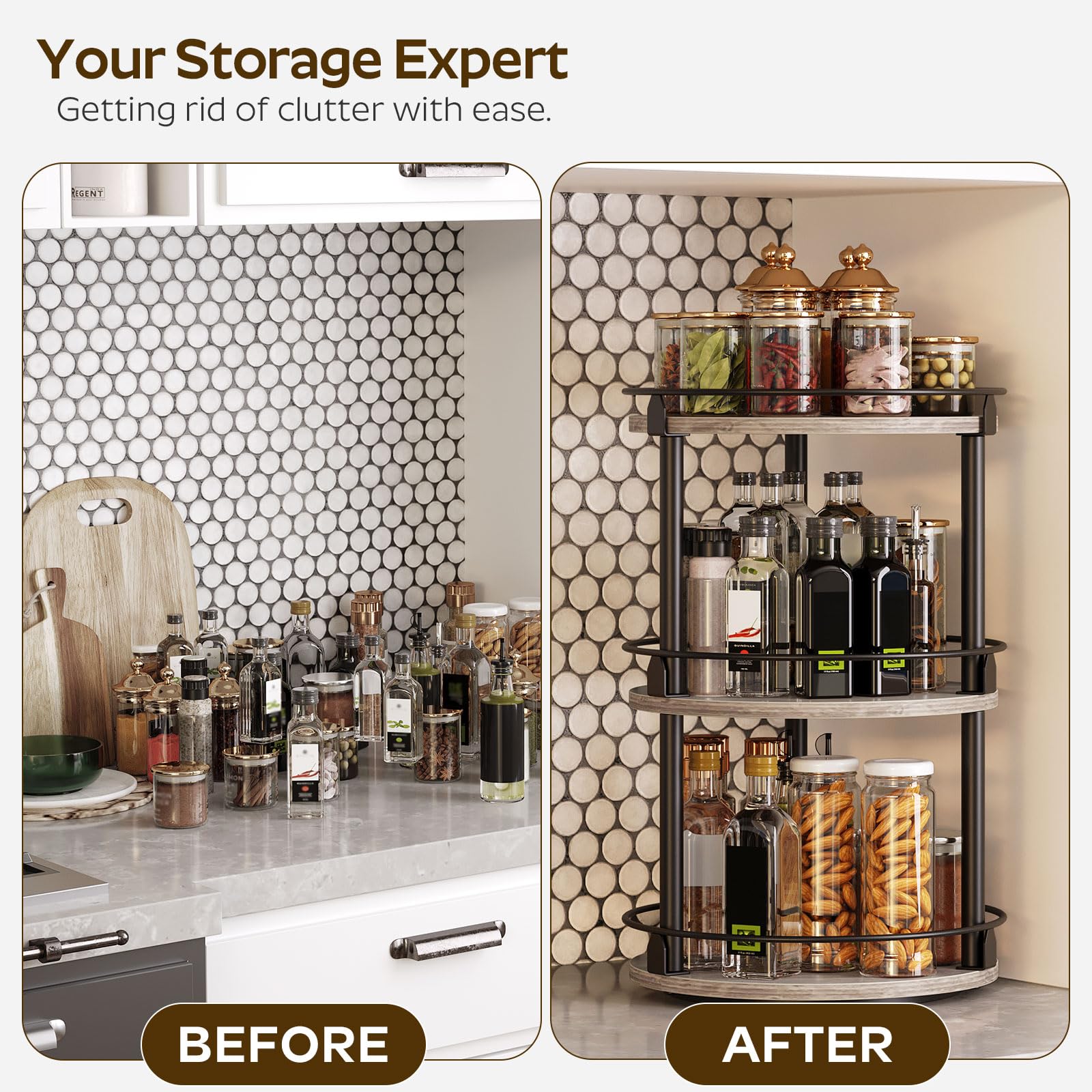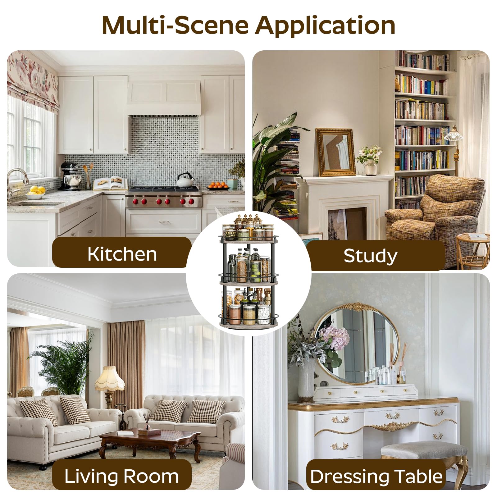 Capacious Space: Sizing 10.2"L x 10.2"W x 18"H, this lazy susan organizer is divided into 3 layers for layered and partitioned storage to help eliminate clutter. 7.5" layer spacing design facilitates accommodating bottles of different heights