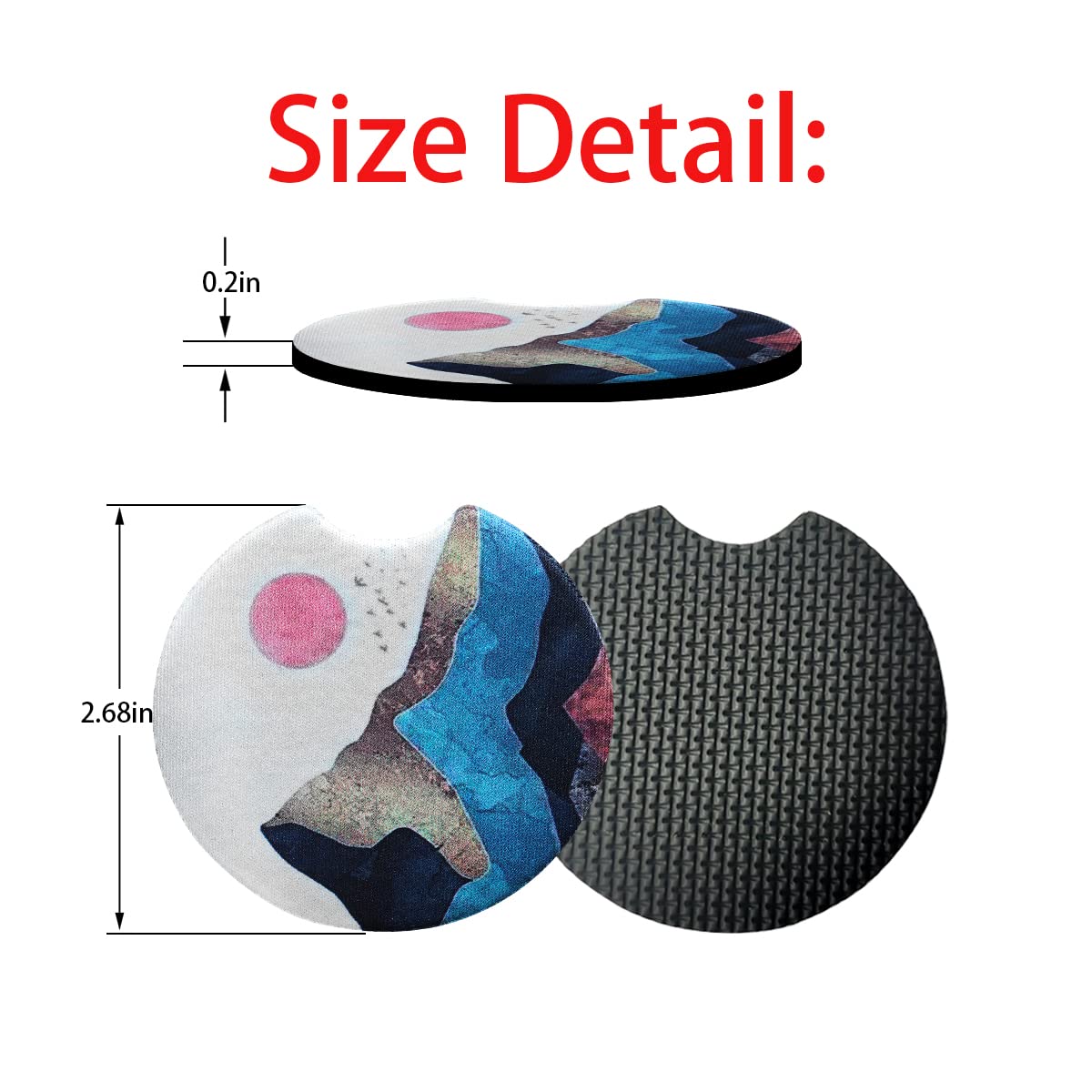 Colour and Size: A variety of colors for you to choose.These are sold in a set of 2 and measure 2.75 inches in diameter and are 0.16 inches in thickness.The car coasters are a universal size, but we still recommend measuring for your vehicle as every car is different.