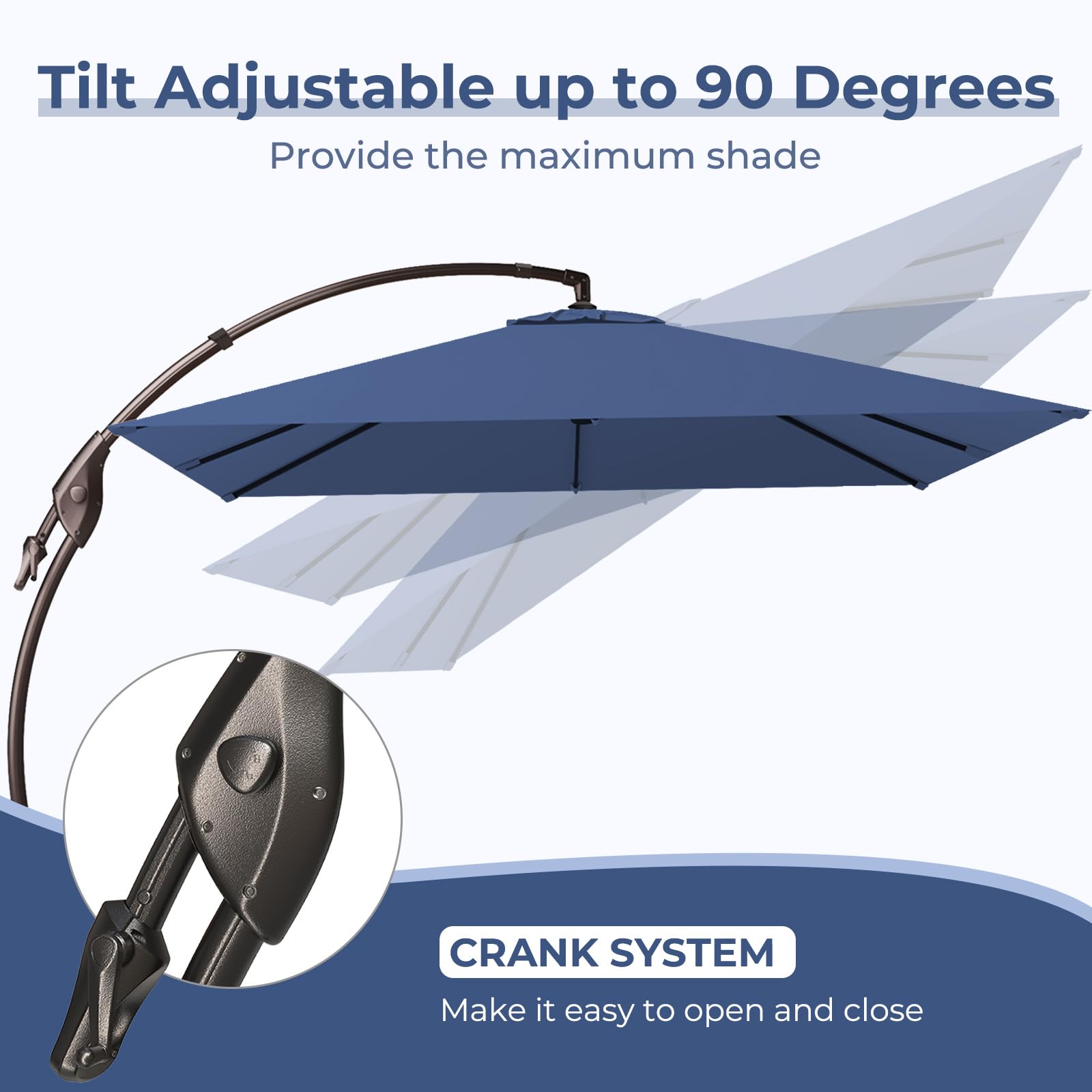 Wide Cantilever Coverage: Provides up to 100 sq. ft. of cooling shade. The adjustable auto-lock tilt lets you easily follow the sun’s movement, keeping your space shaded all day long.