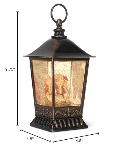 Kneeling Santa Over Baby Jesus in a Bronze Toned Lantern Size: 9.75"H 4.5"W 4.5"D Material: Plastic Features a Light with Glittery Snow Swirling Around Santa and Baby Jesus Requires 3 AA Batteries, NOT INCLUDED