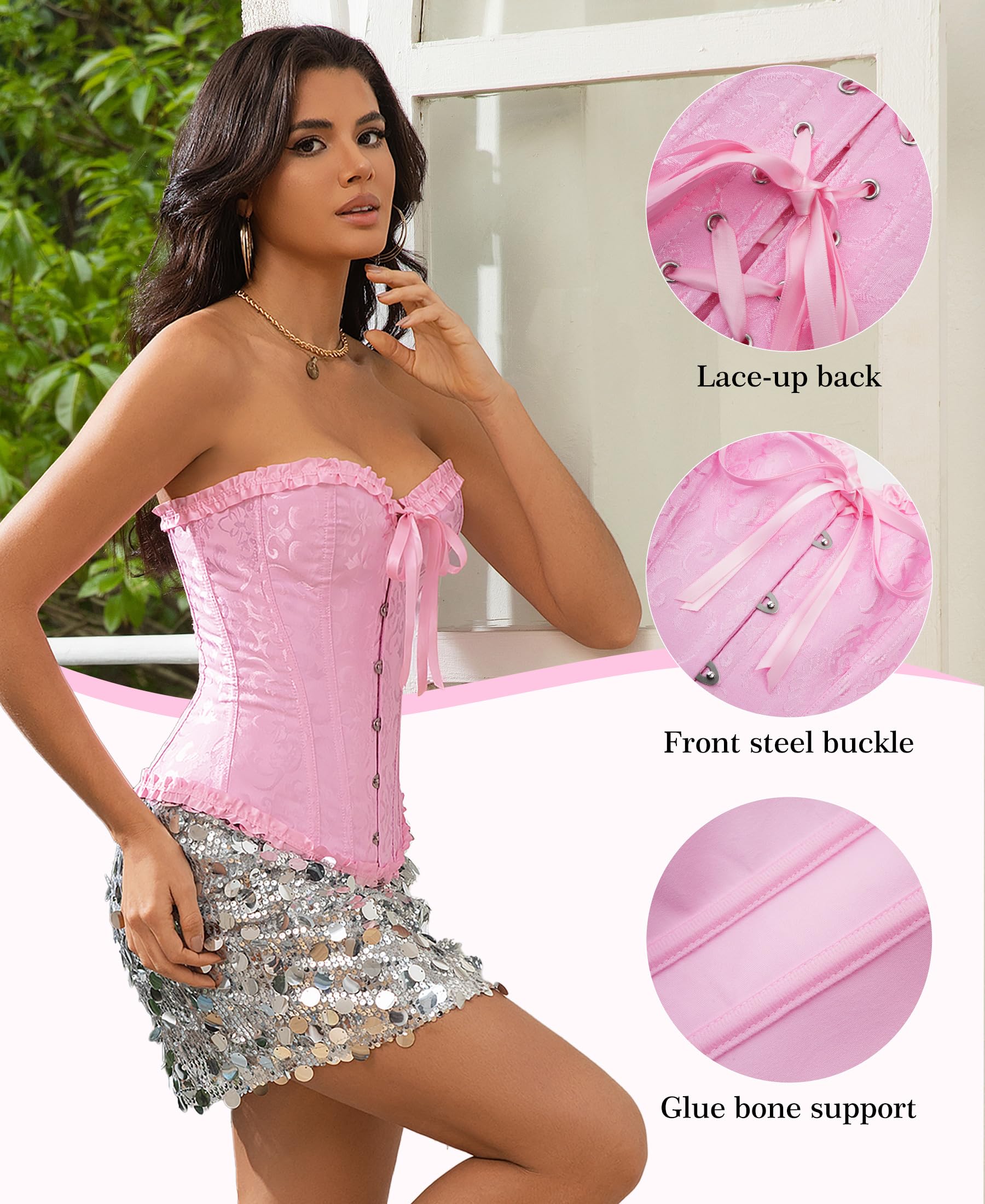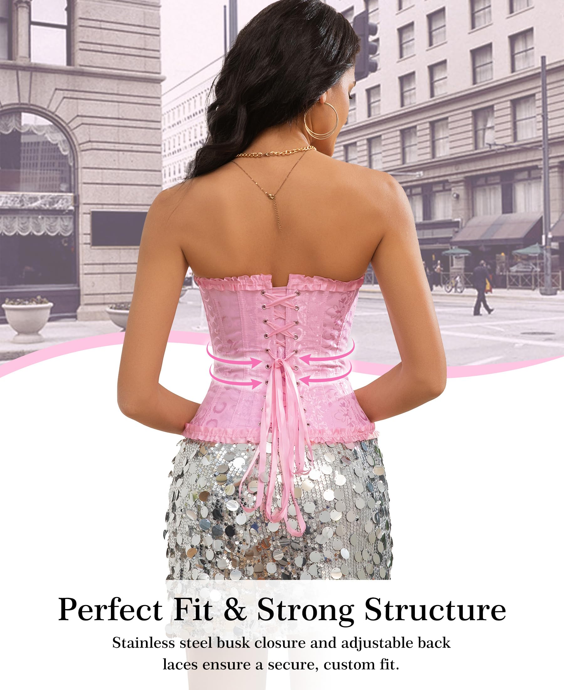 ALL DAY COMFORT: Our overbust corset top is a harmonious blend of comfort and elegance, made with materials that caress your form while ensuring freedom of movement. The waist corset unique 12 plastic bone structure is engineered to support an upright posture, reducing back strain. Designed for wearability from dawn until dusk, the waist cincher corset is the ideal everyday companion. Our lace corset top aligns with your body's needs and your heart's desires.