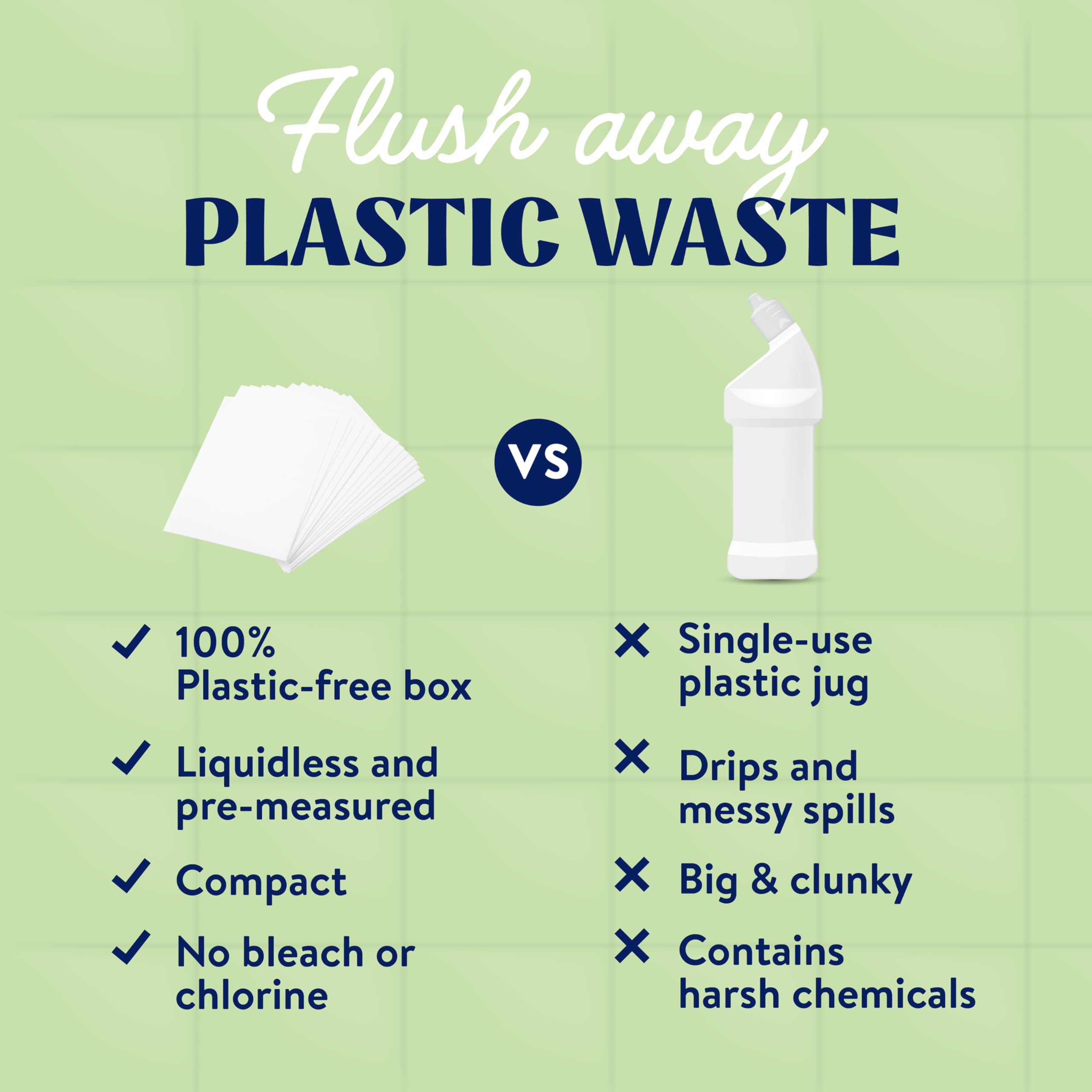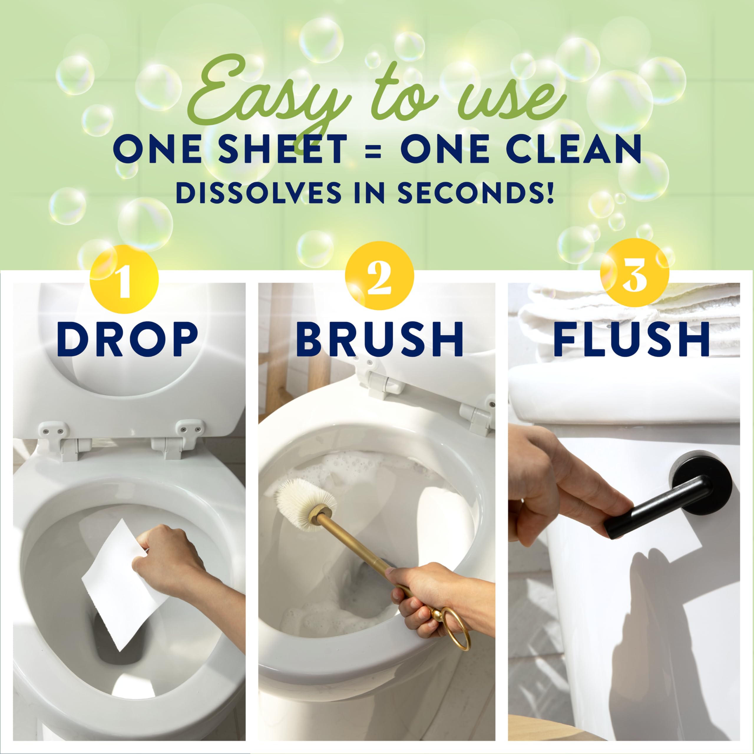 Easy to Use - Drop, Brush, Flush: Simply drop a pre-measured sheet into the toilet bowl, wait for it to dissolve, brush with the sudsy water for a thorough clean, and flush away stains, rings, and odors. No splashing, no squirting, and no mess—just a sparkling clean bowl with minimal effort