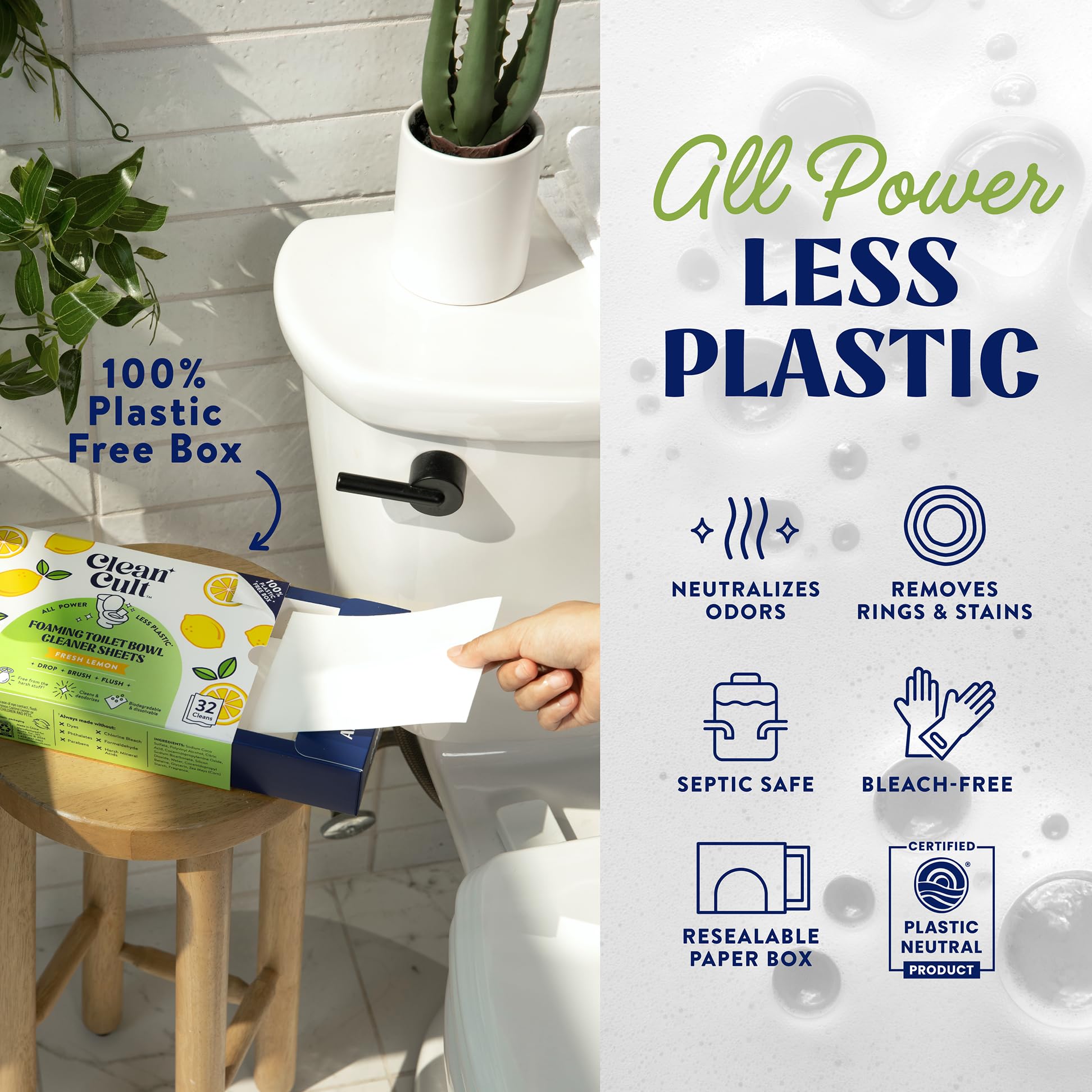Plastic-Free Packaging: Our packaging is plastic-free and 100% recyclable, helping to reduce single-use plastic waste. Each resealable pack contains 32 sheets, offering a convenient and environmentally conscious cleaning solution. Enjoy a fresh lemon scent and powerful cleaning action with less environmental impact