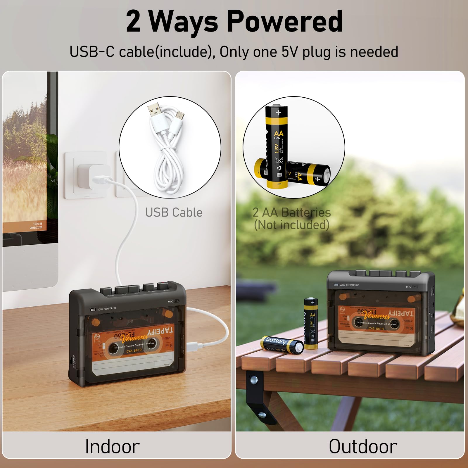 【Dual Power Supply】The cassette recorder supports two power options: two AA batteries or a DC 5V power source. When an external power source is available, connect the included USB to Type-C cable to a 5V power adapter (sold separately). In outdoor settings without power access, using two AA batteries (sold separately) is generally recommended. Select the power source based on your actual needs.