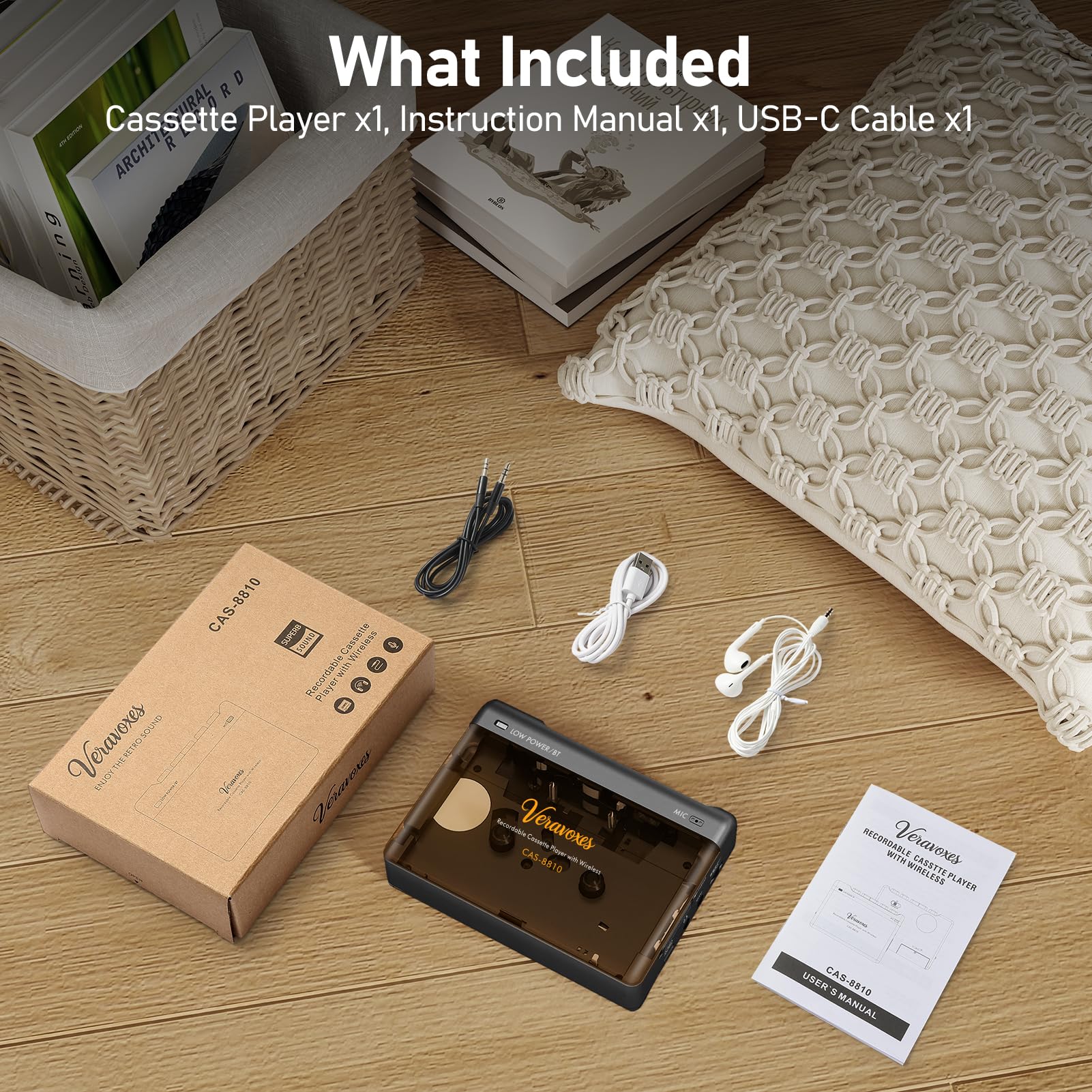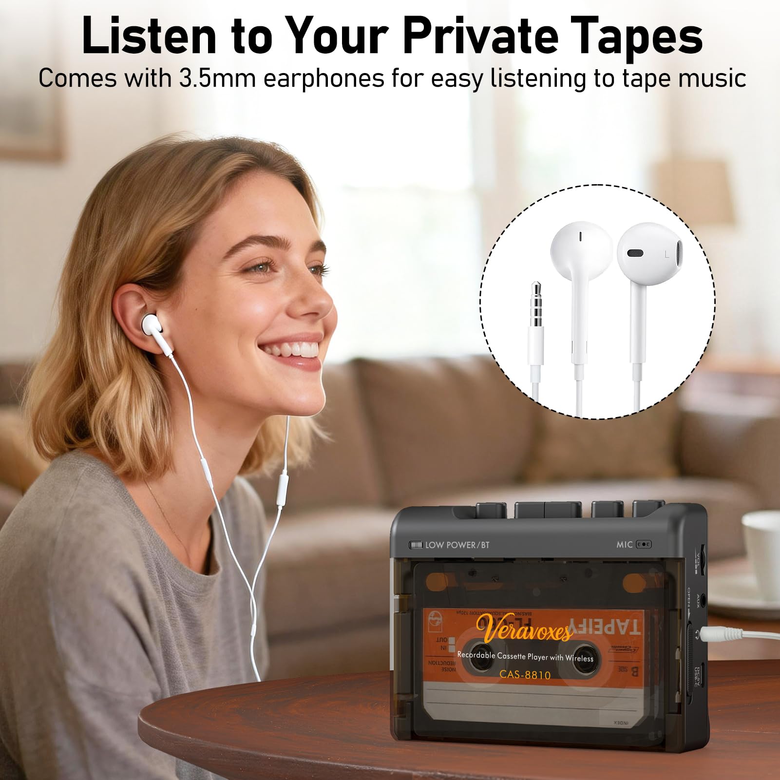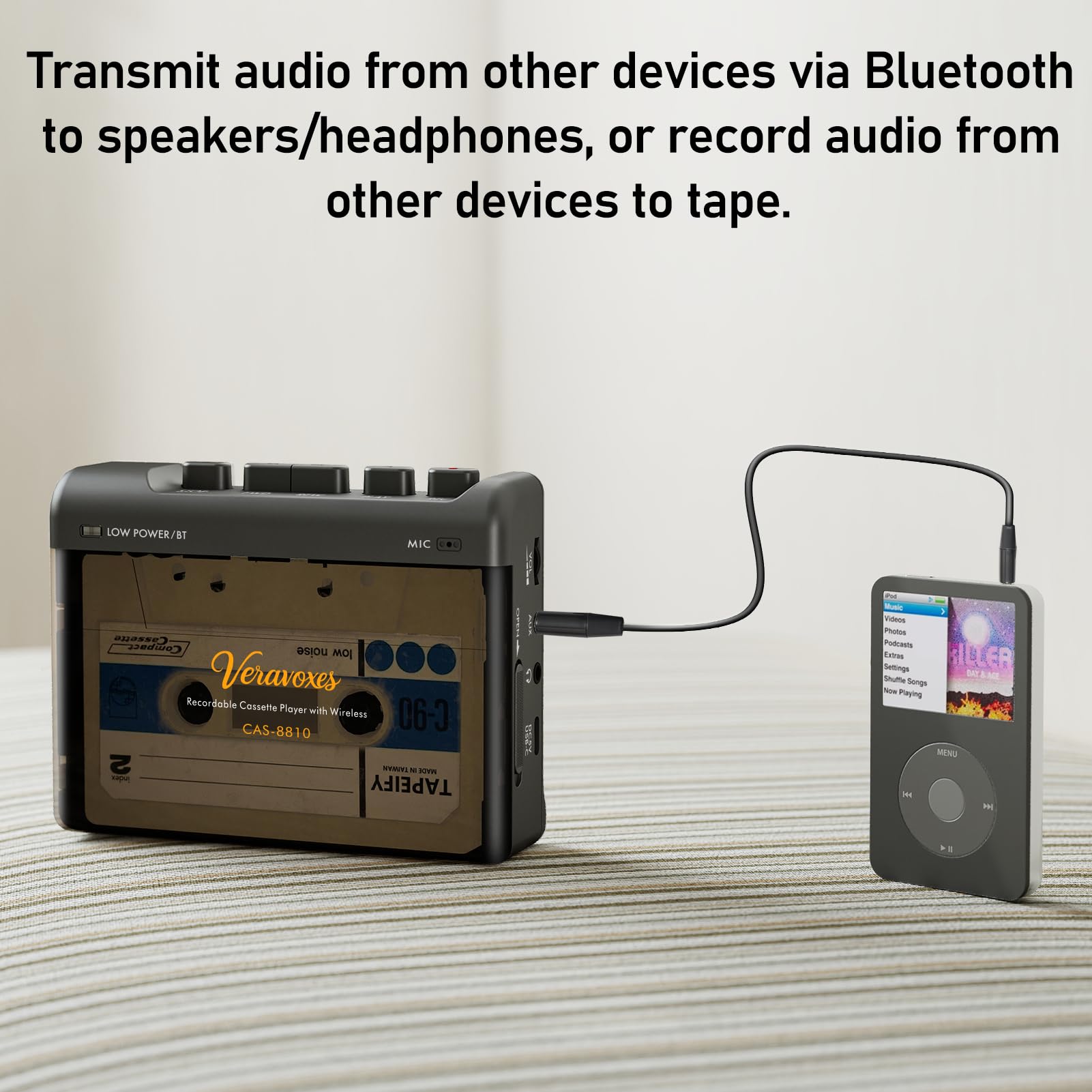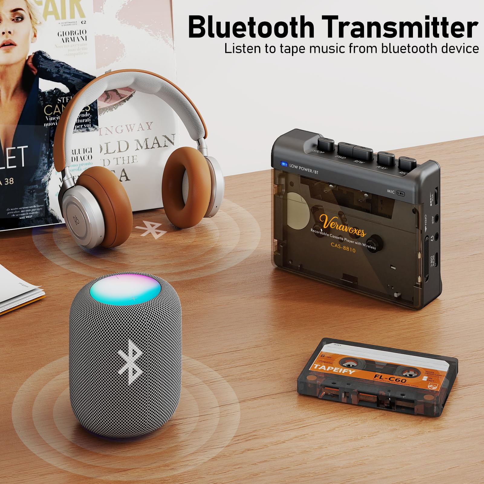 【Bluetooth Cassette Player】This portable cassette player features a Bluetooth 6.0 transmitter for faster, more stable connections. Easily pair with Bluetooth headphones or speakers to wirelessly enjoy cassette music. Note: Bluetooth transmission is solely for connecting Bluetooth headphones/speakers to listen to cassette music. It cannot be used to connect to a phone for music playback (does not support in-car Bluetooth connection).