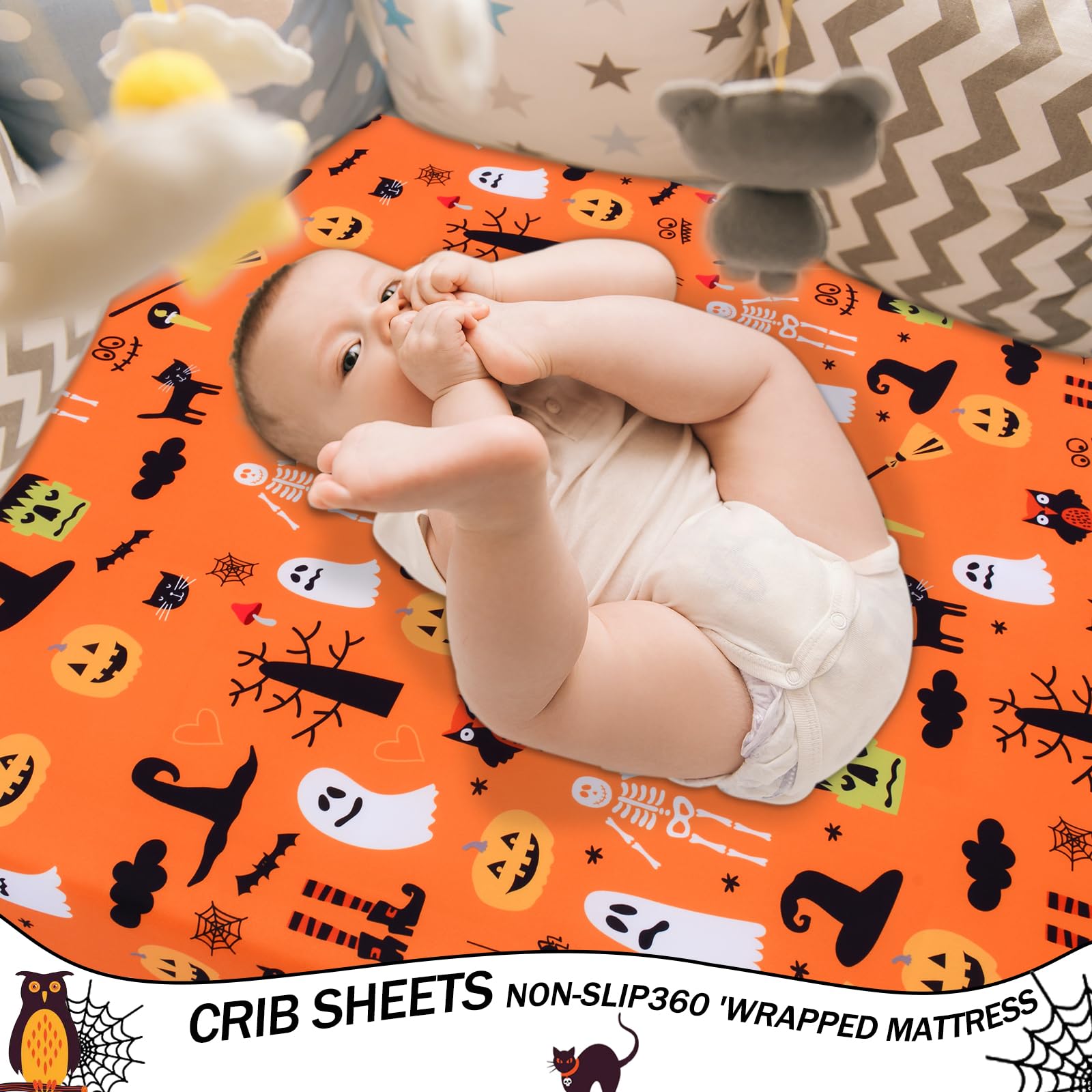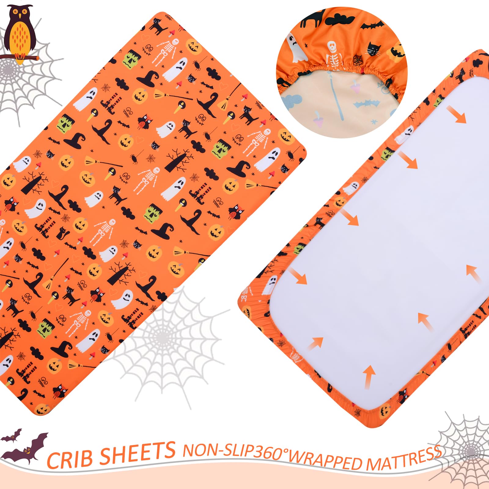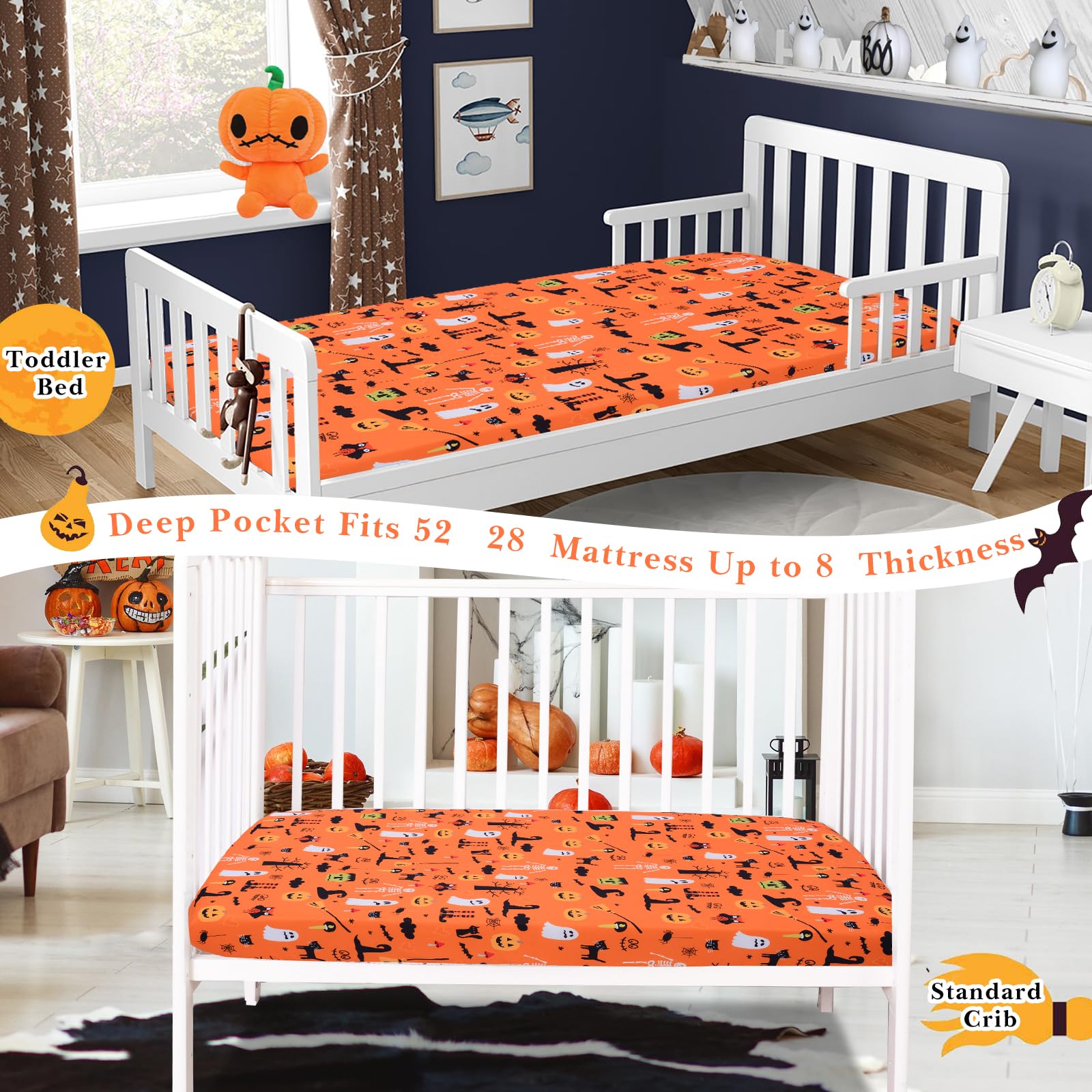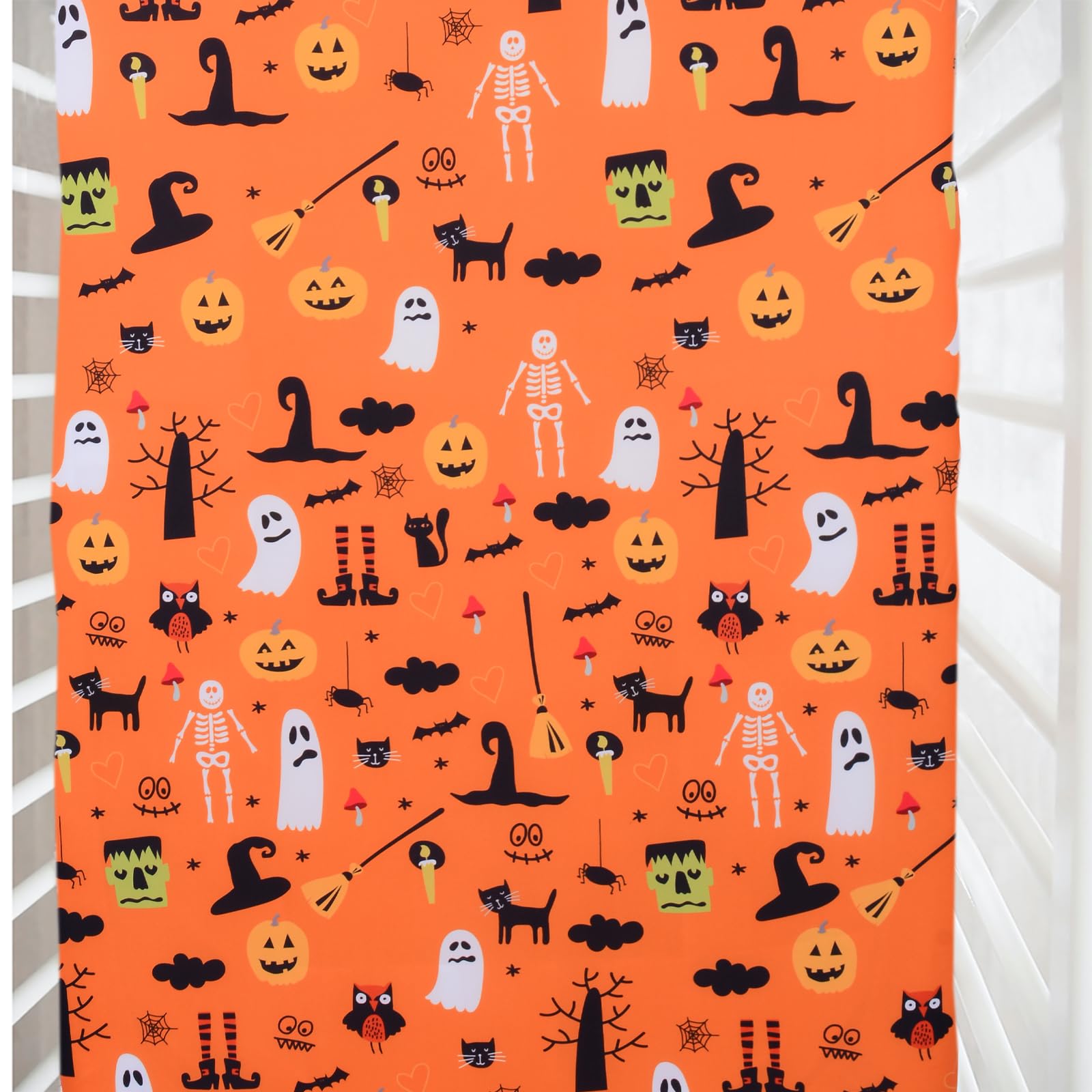 【PERFECT GIFT】The crib sheet comes with elastic bands that fit snugly to the mattress and stay smooth, making it the perfect fall and Halloween baby room decoration.Complement any nursery design.Your baby will love this fun new addition to their bedroom. It is also a perfect gift for birthdays,Halloween,Thanksgiving,and other occasions.