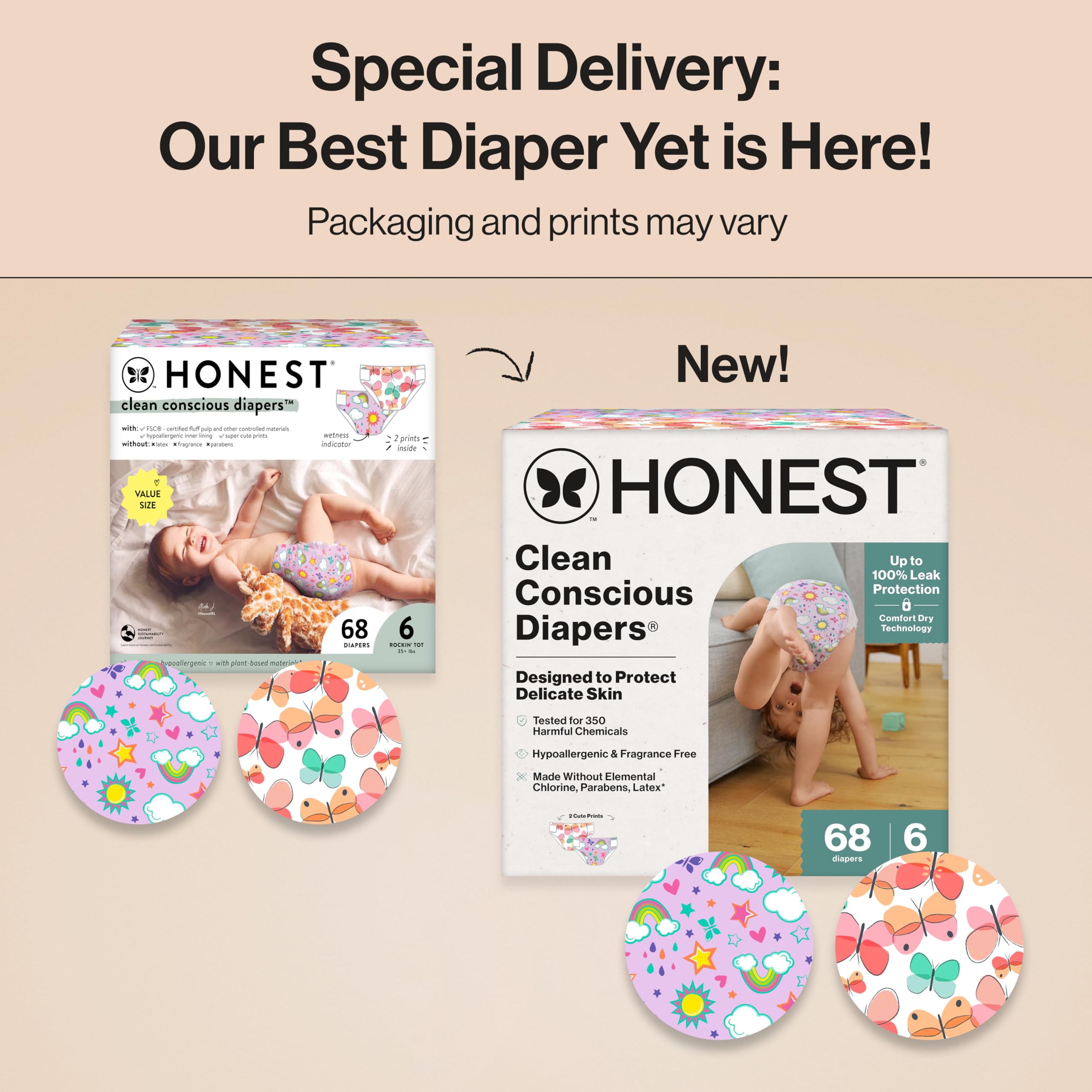 Designed to protect delicate skin, Honest Clean Conscious Diapers keep baby comfortable and dry through all the wiggles and wobbles! Our softest diaper yet delivers up to 100% leak protection with Comfort Dry Technology. The hypoallergenic, plant based inner liner, flexible stretch wings, super absorbent core, and channel technology provide a comfy, secure fit for all ages and stages. Because safety is top priority, these diapers are OEKO-TEX STANDARD 100 Certified, a 3rd party that tests for 350 harmful chemicals, and made with FSC Certified Fluff Pulp and other controlled materials. And for cuteness overload, each diaper features a super cute print!