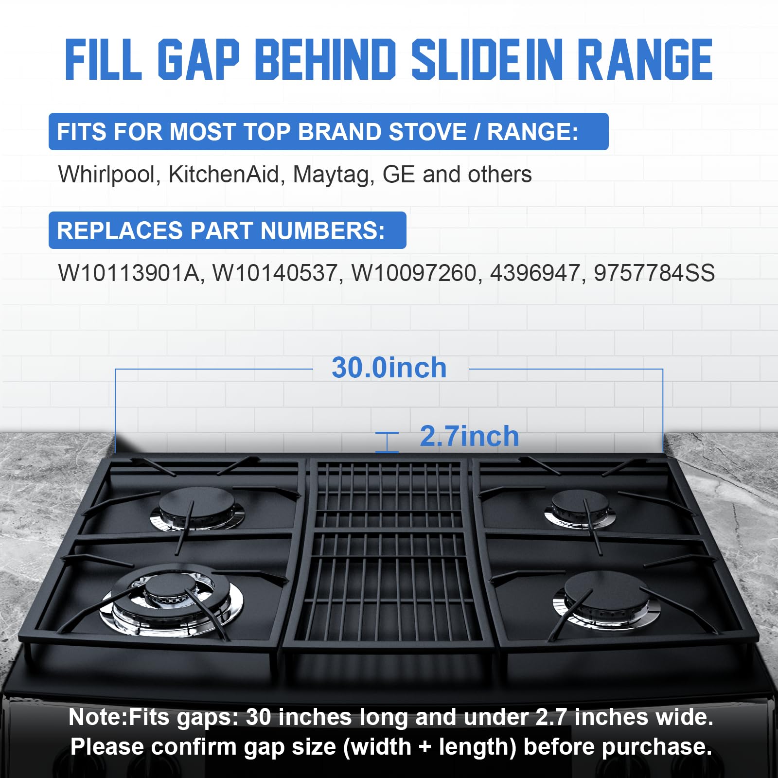 Stove Gap Filler Kit: This 30 inch slide in range gap filler is used to fill space behind slide in range. Stove gap fits for Whirlpool, Samsung, Kitchenaid, Frigidaire, GE and most cook top brand stove. Replaces part numbers: W10113902A, W10140537, W10097260, 4396947, 9757784SS. Prevents food and debris from falling between these hard to clean spaces.