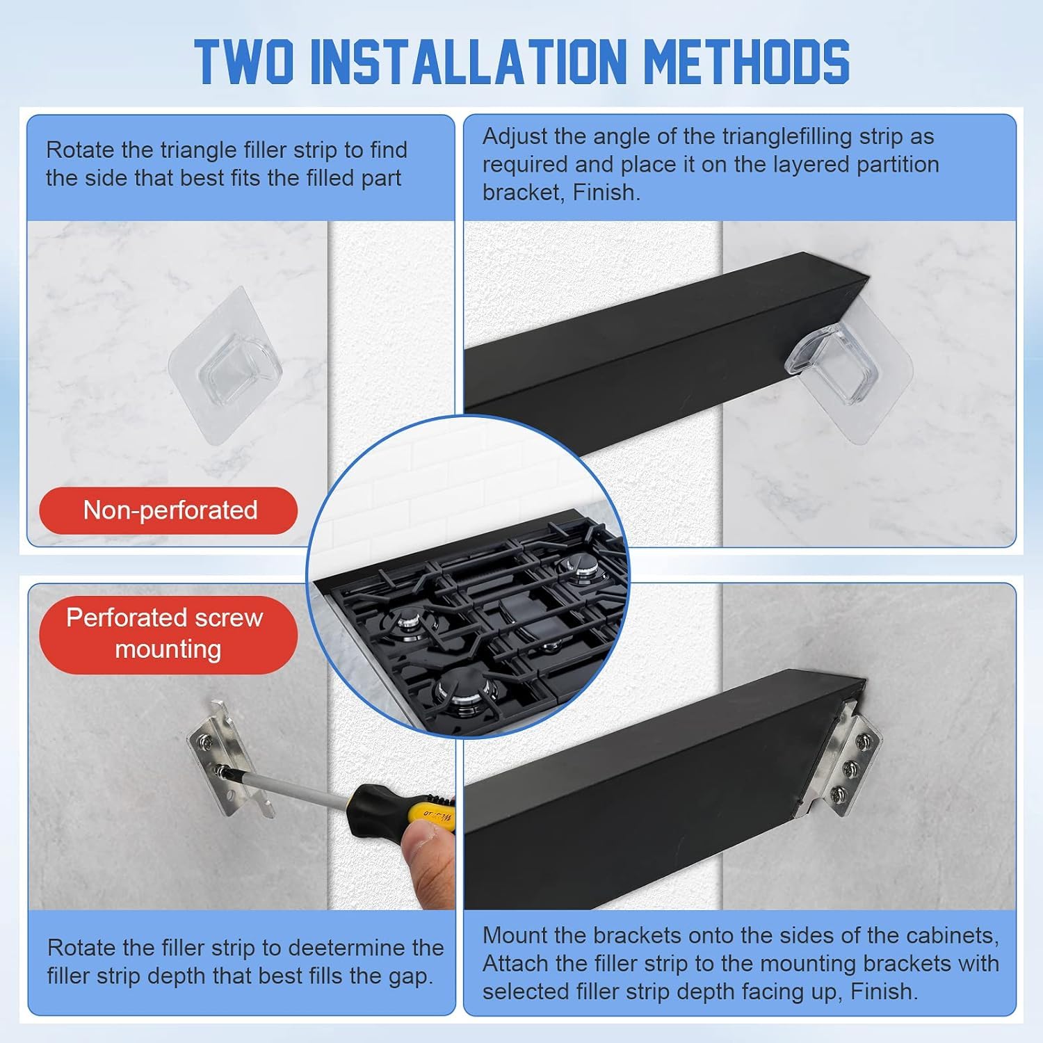 What Will You Get: This black stove back gap covers for backsplash behind stove includes 1 Triangular fill strip, 2*Nopunching self adhesive bracker, 2*Non-slip mounting brackets, 6*Screws and 1 Installation instructions. And the trim kit for slide in range are great addition to your kitchen, and great gifts to prevent sludge, debris, spills and other things from falling in between the seams of your stove, stove gap guard, gas, stove top, cooktop, countertop, oven, home kitchen counter, desks and other impossible to clean places