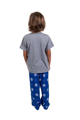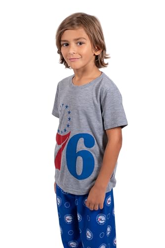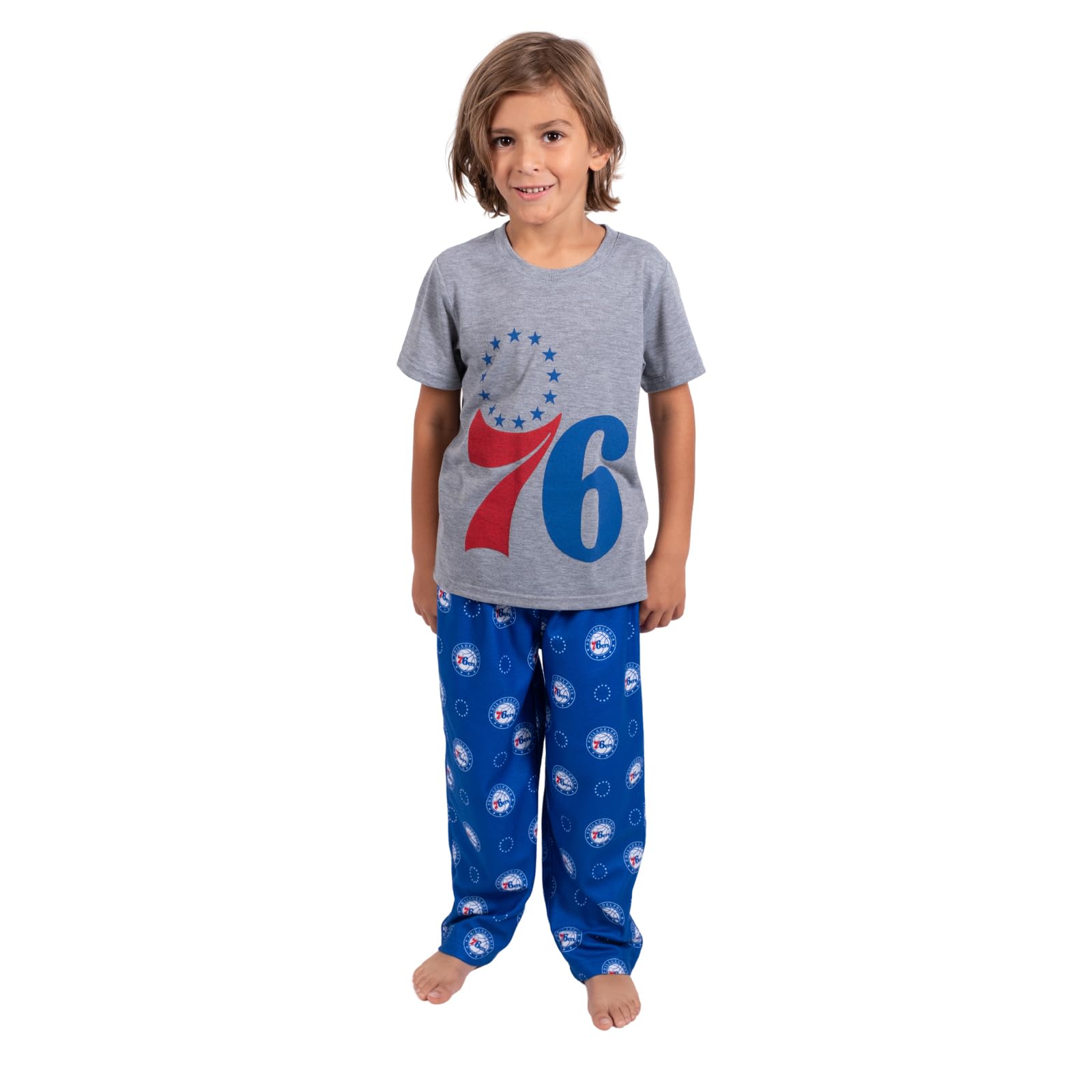 TEAM PRIDE: kids can show their NBA team pride from top to bottom with this set. The bottoms have an all-over print with the team's primary and secondary logos. The top has one large screen print of the primary logo across the front.