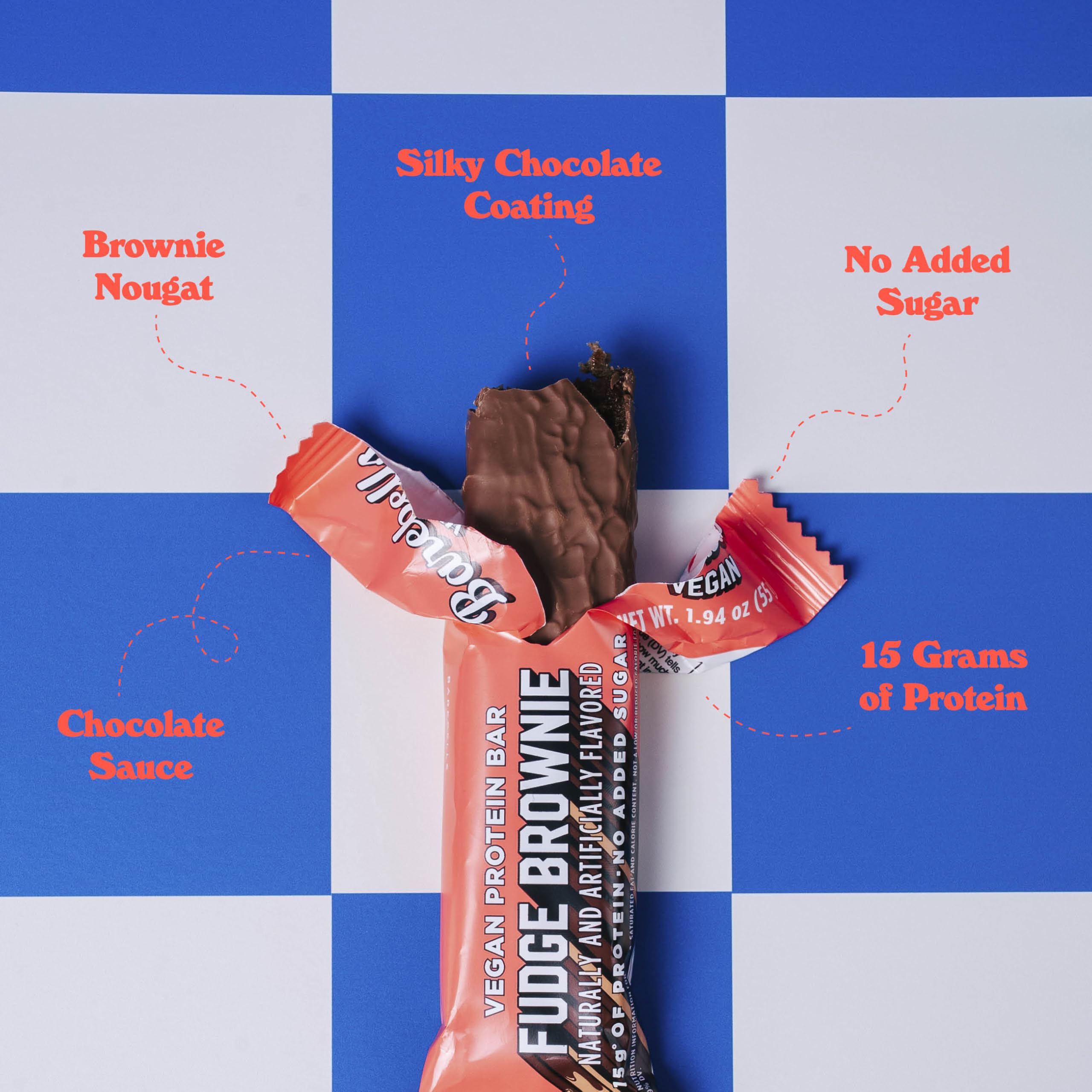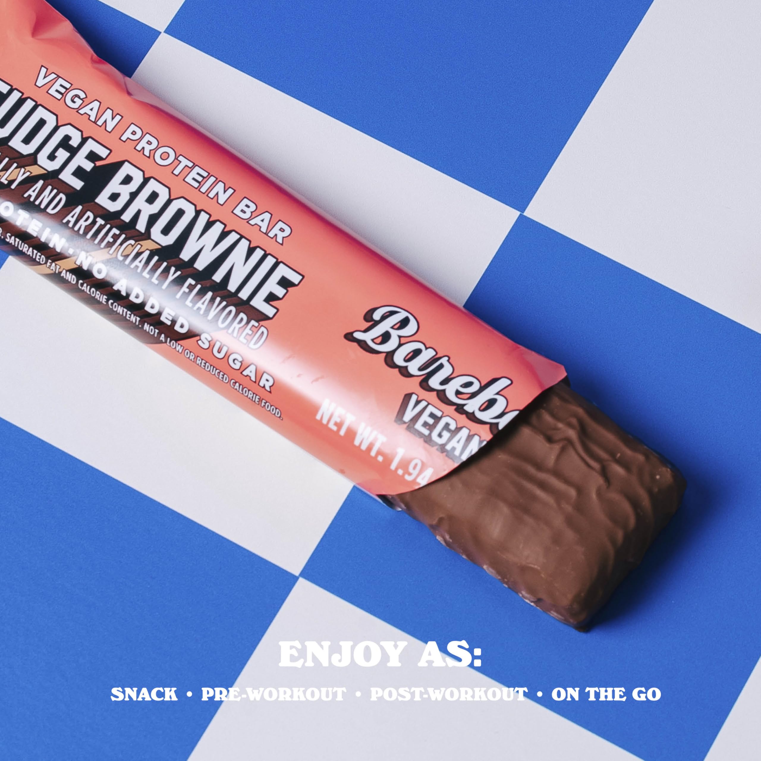 BAREBELLS PLANT BASED FUDGE BROWNIE PROTEIN BAR – 12 decadent bars per box! Craving something chocolatey and plant-based? This rich, fudgy delight delivers brownie-level indulgence with 15g of protein from soy, peas, and rice. Certified Vegan, no added sugar, palm oil free—and dangerously delicious.