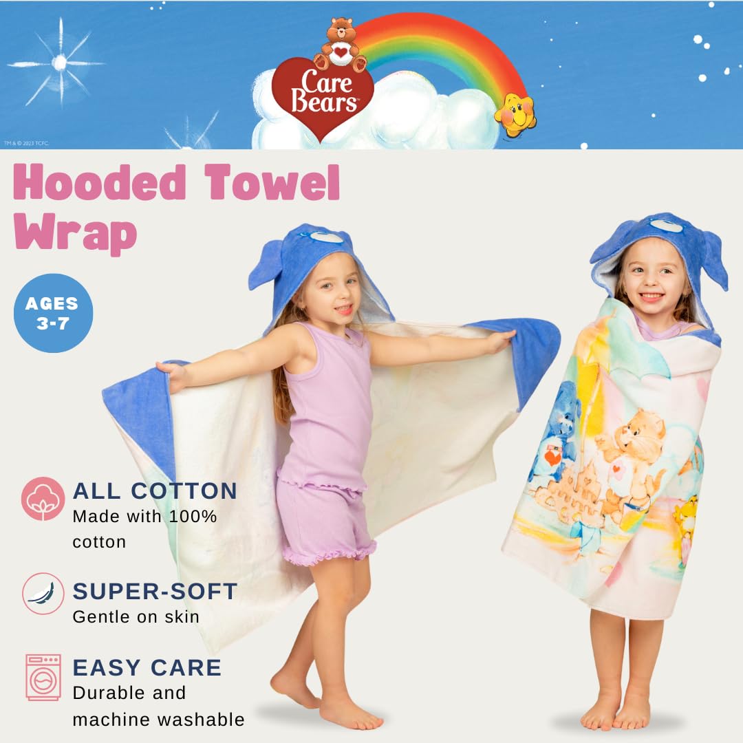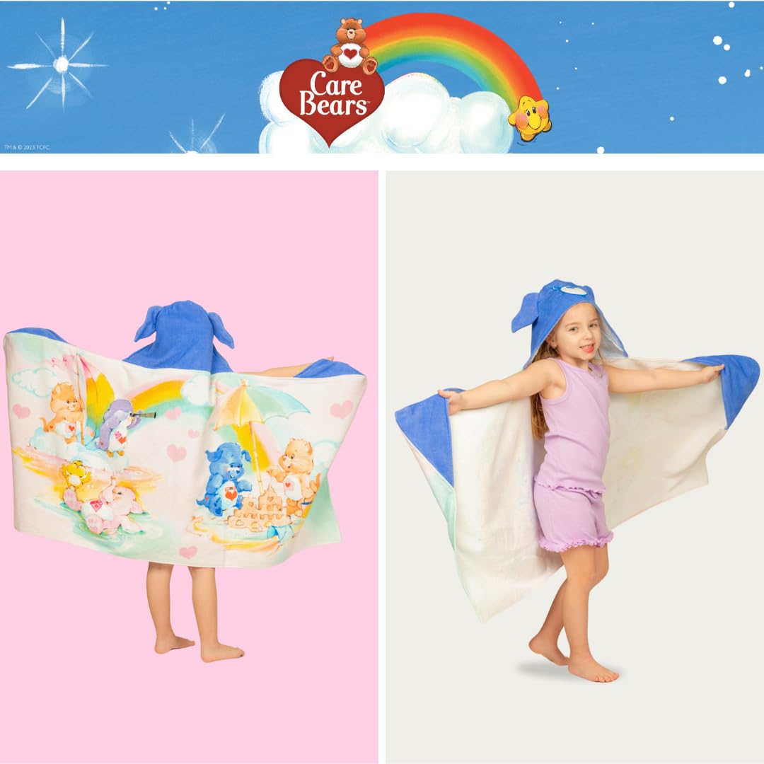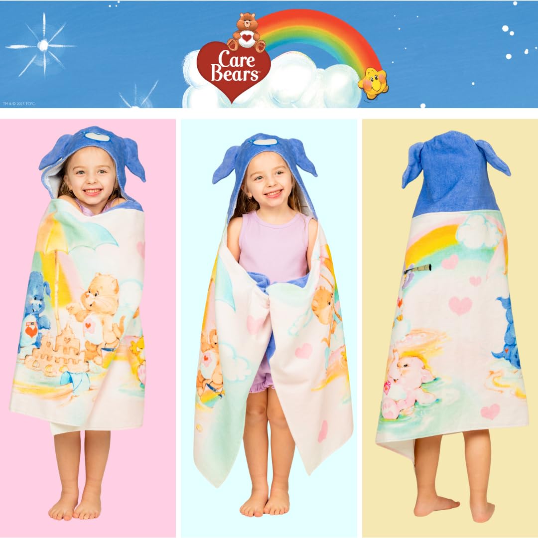CARE BEARS DESIGN: Wrap your little one in nostalgia with the Care Bears Retro Hooded Towel. Featuring classic Care Bears graphics, this towel adds a touch of timeless charm to bath time. The soft, absorbent fabric keeps your child cozy, making every post-bath moment a huggable adventure. Care Bears magic for today's cuddles.