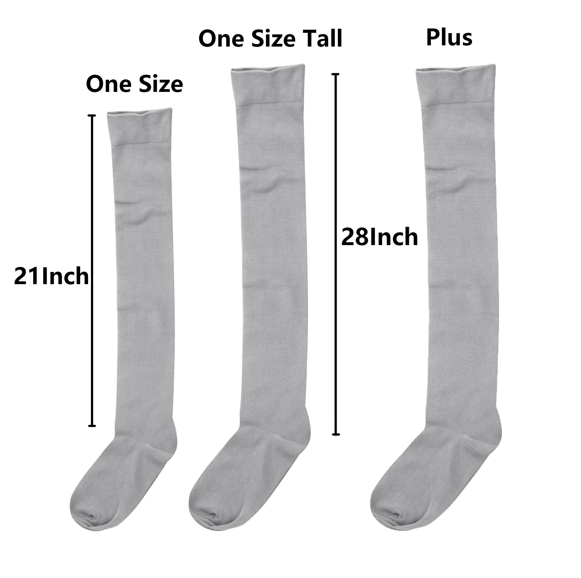 3 Size: One size: the length from the top to the heel is about 21 Inches/53 cm, maximum thigh circumference is about 21in, Recommended for heights 5.0 - 5.7ft. One size tall: the length from the top to the heel is about 28 Inches/72 cm, maximum thigh circumference is 23in, Recommended for tall heights 5.4 - 5.9ft. One size plus tall: the length from the top to the heel is about 28 Inches/72 cm, maximum thigh circumference is about 25in, Recommended for heights 5.5 - 6ft