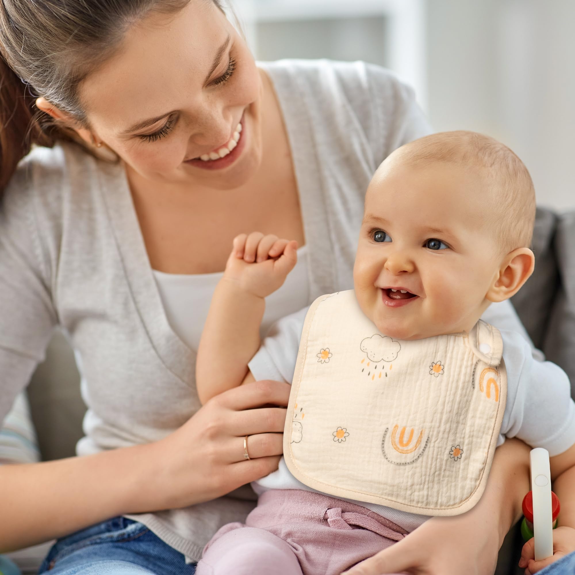 Unique Design: You will receive 6 different patterns of baby bibs, all in vintage beige color. The bibs have cute elements such as rabbit, moon, bear, rainbow and mushroom. The bibs are designed to be fashionable and fun for your baby's daily wear.