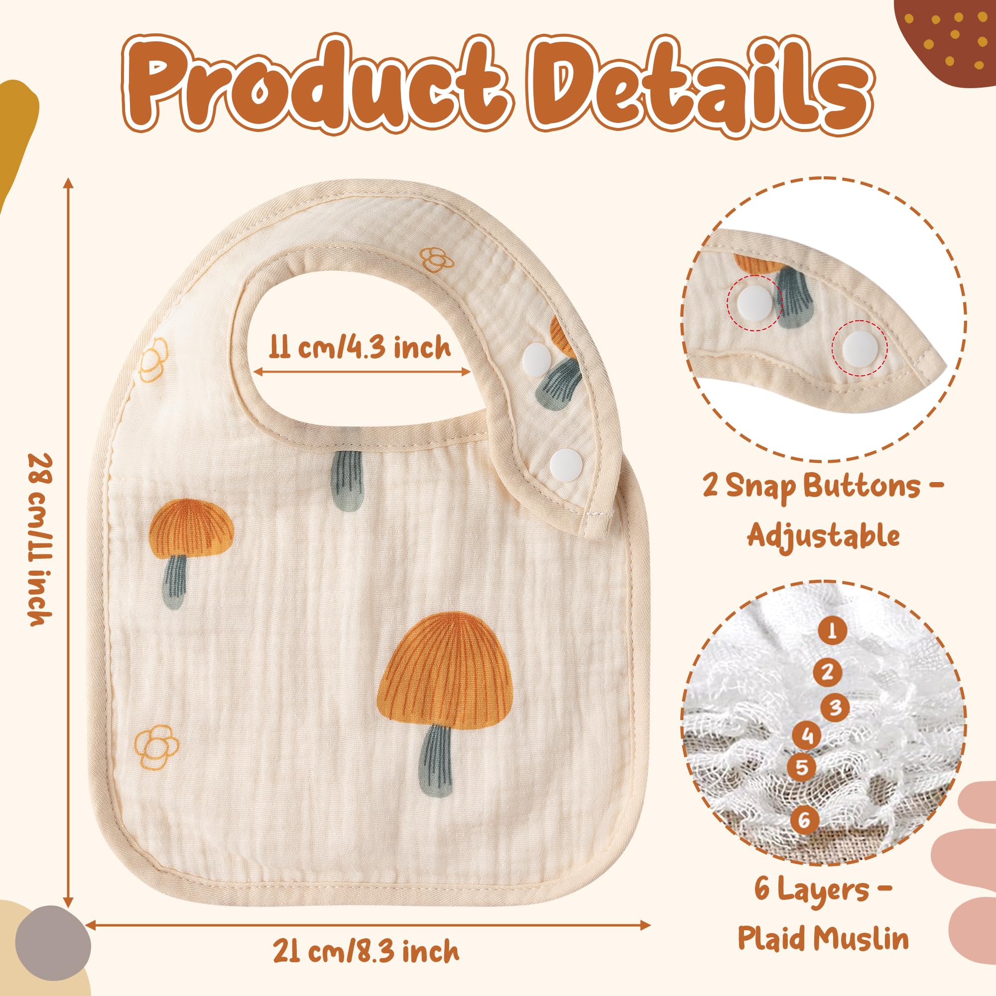Material: Our baby bibs are made of pure cotton sheer, lightweight and breathable. Babies wearing soft material bibs will feel comfortable, and sensitive skin will also be well cared for.
