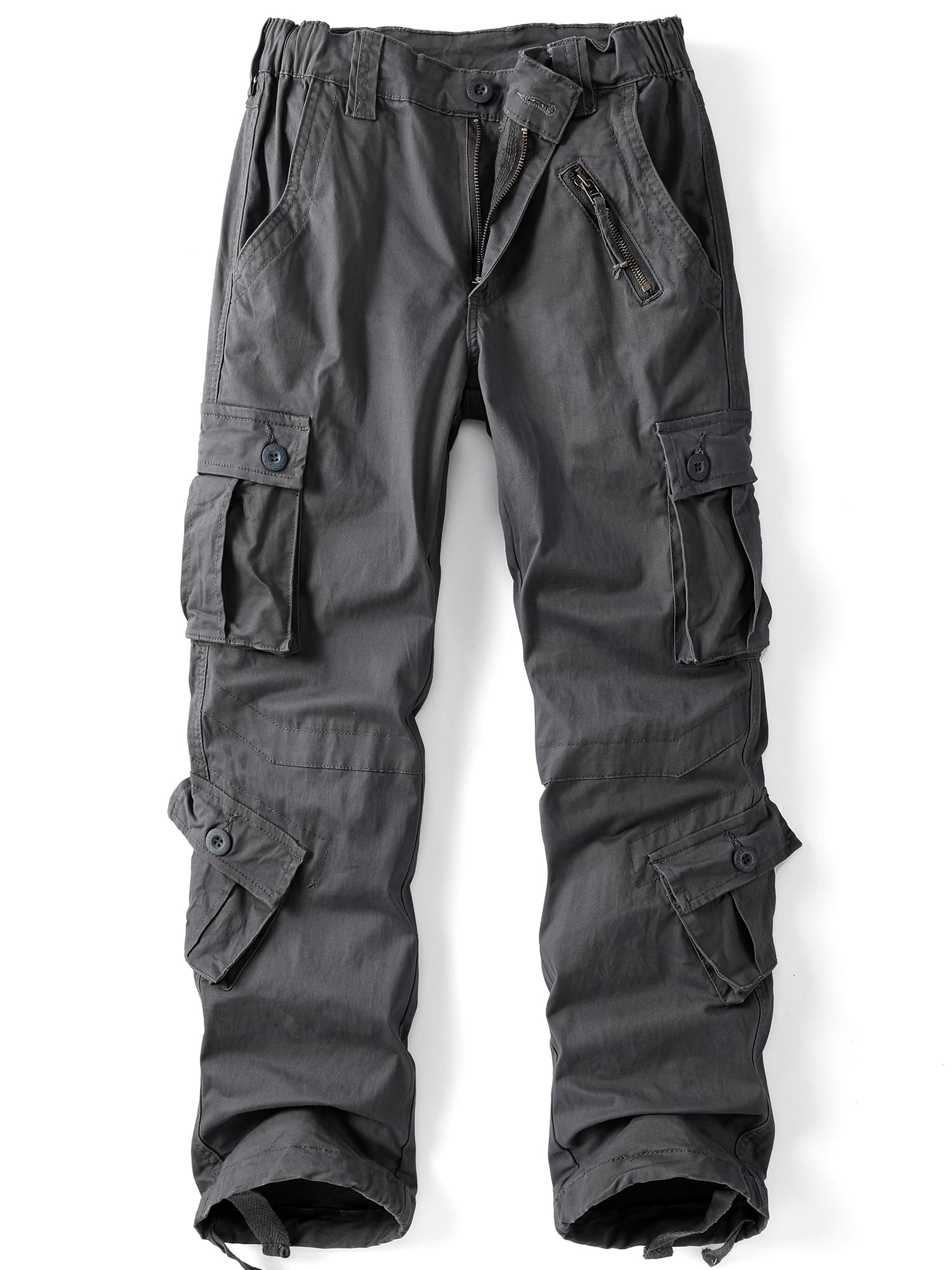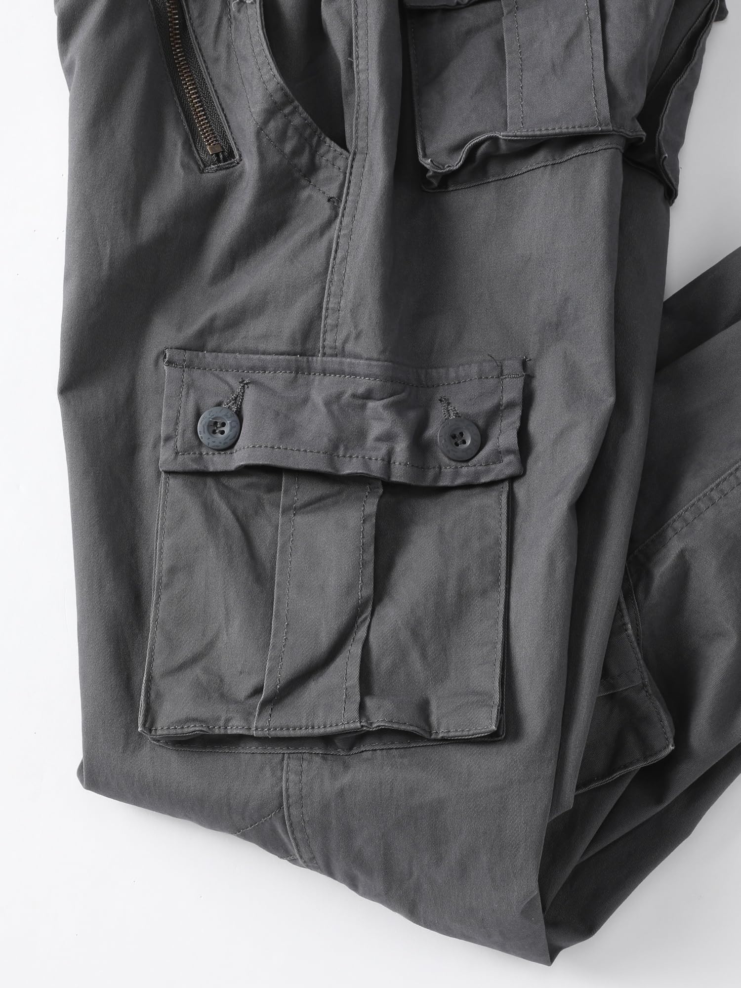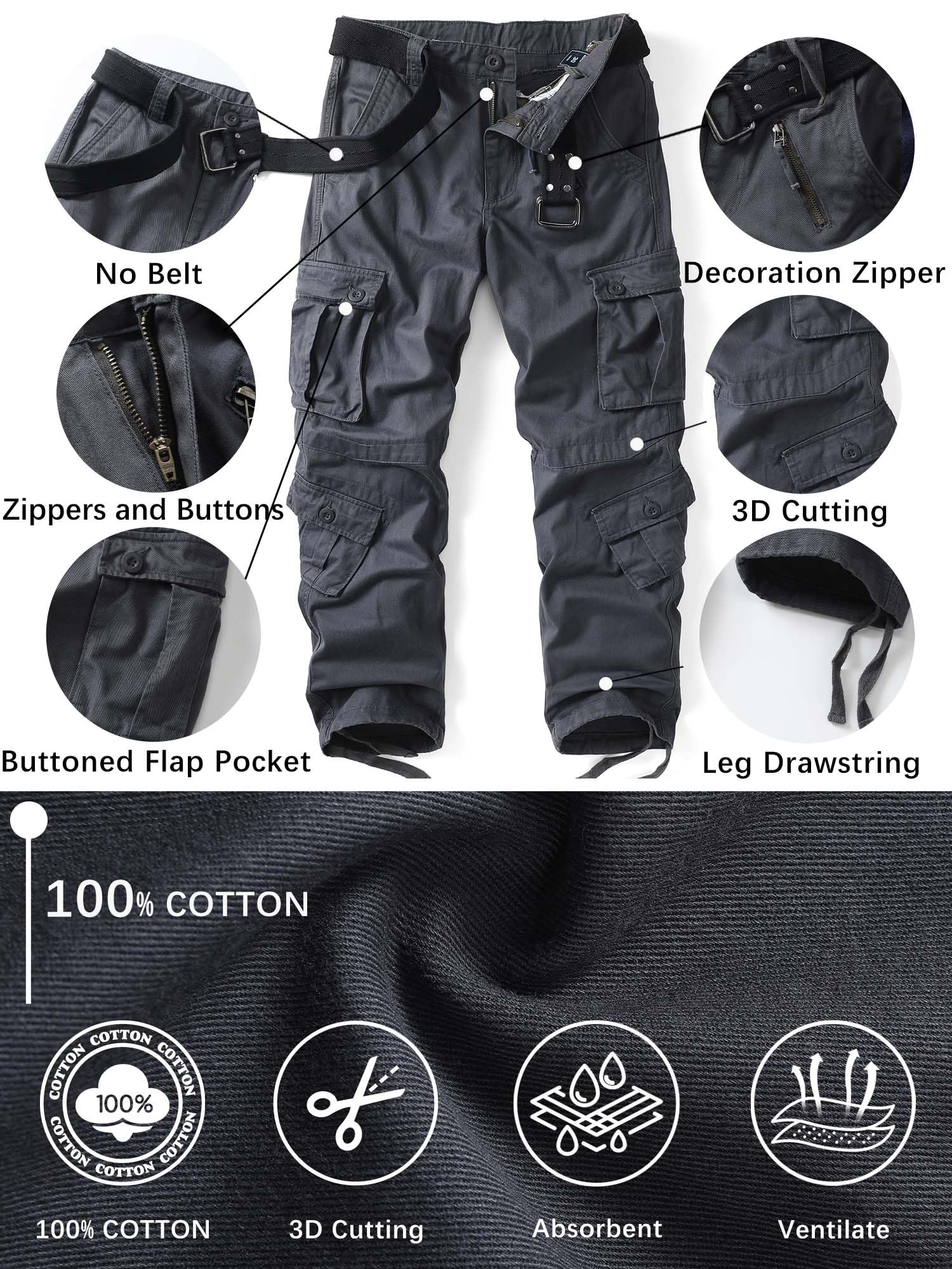 Product Design:Classic cargo pants with 8 pockets, all three-dimensional design with hand pockets x2,extra buttoned flap pockets x2 , side fast opened large pocket x2,rear pockets x2, makes it easier to carry additional personal things,Designed with a relaxed fit through the seat and thigh, these men's casual wear will keep you comfortable during any task.It is made of easy care wrinkle resistant fabrics, roomy pockets & sturdy zippers & buttons.