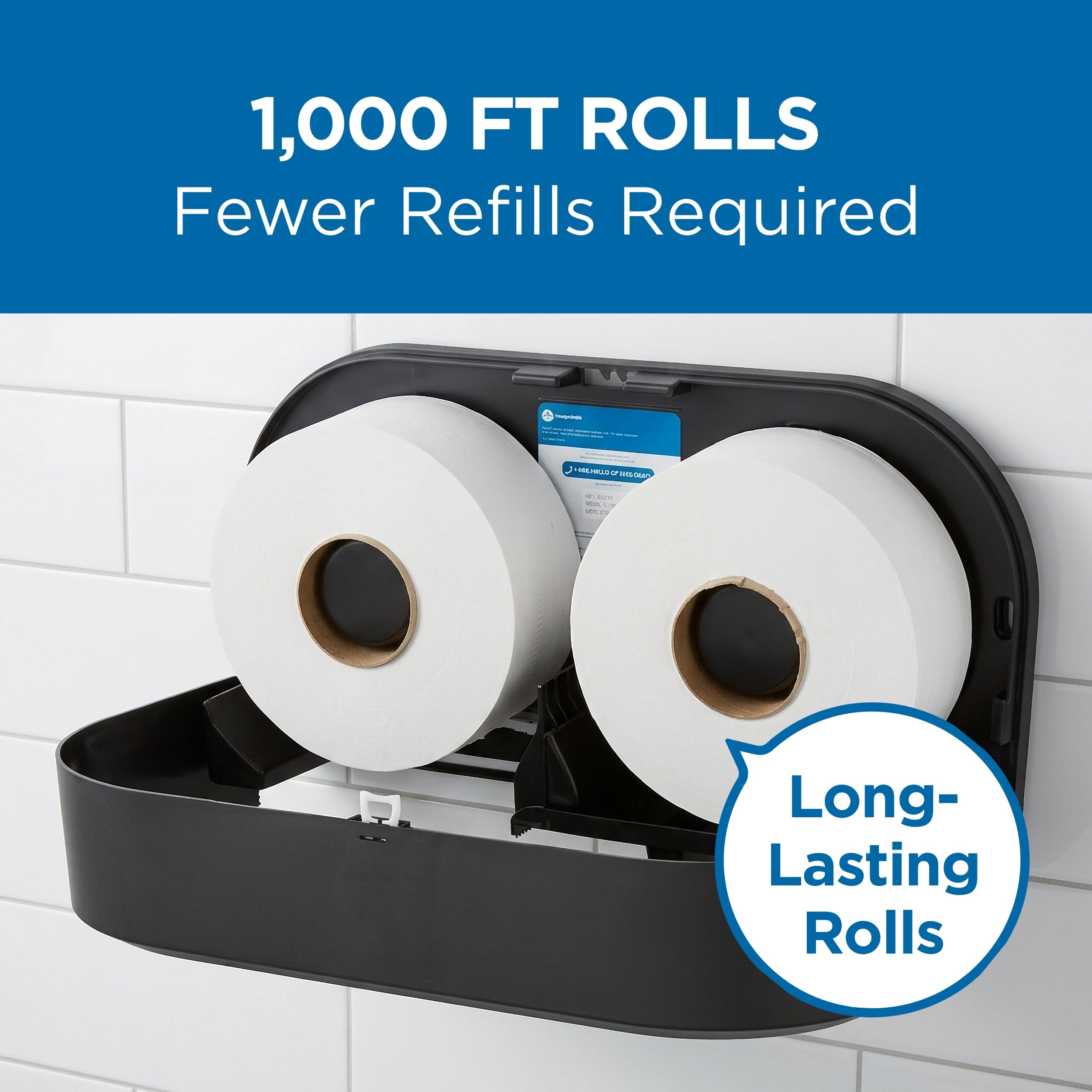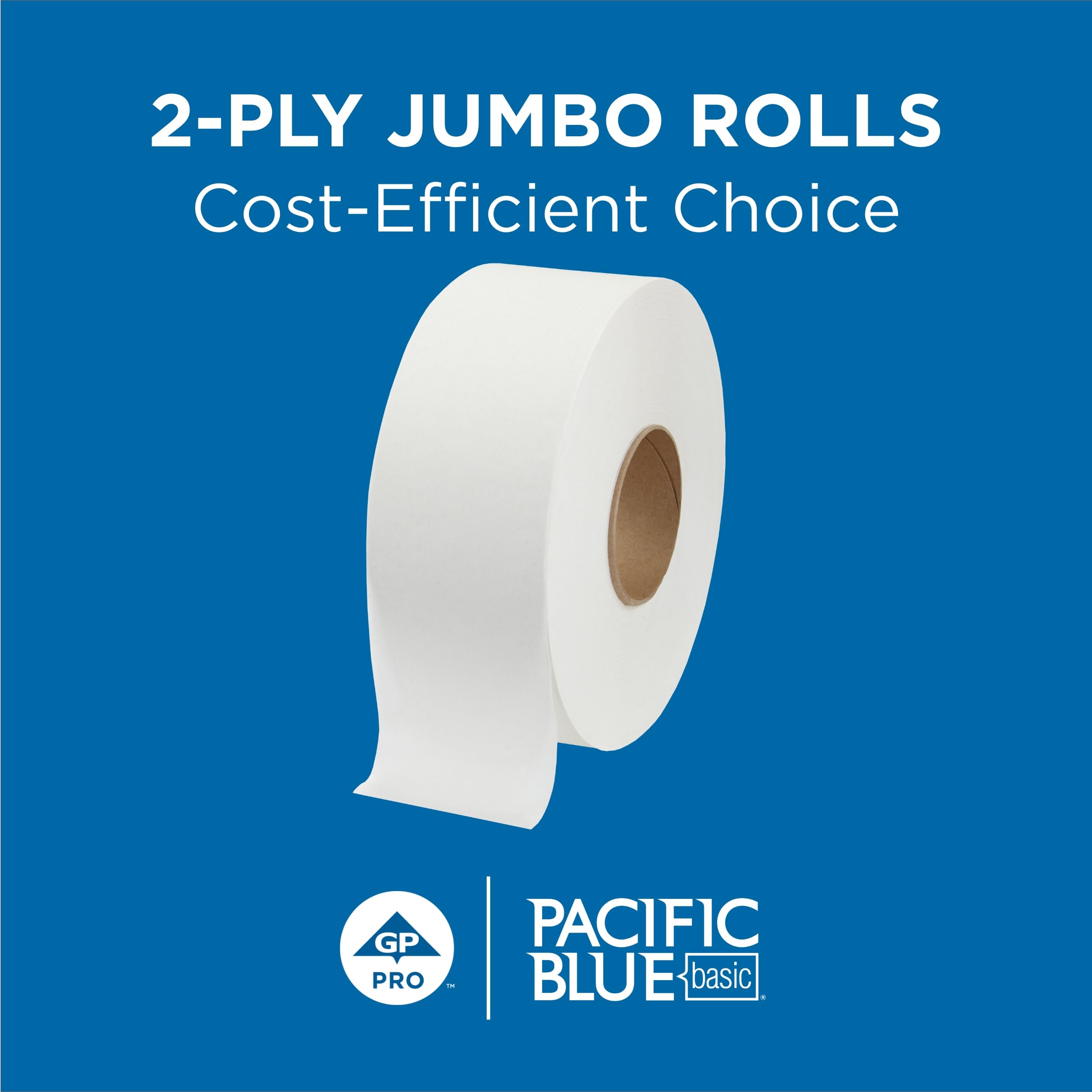 This Pacific Blue Basic jumbo bathroom tissue meets EPA guidelines for minimum post consumer waste and is an economical choice for environmentally concerned customers with high-traffic washroom areas. Ideal for washrooms in public facilities, schools, industrial/manufacturing, retail stores, and cafeterias, quick service restaurants, this jumbo-sized roll delivers 1,000 feet of tissue for reduced maintenance intervals and greater customer satisfaction.