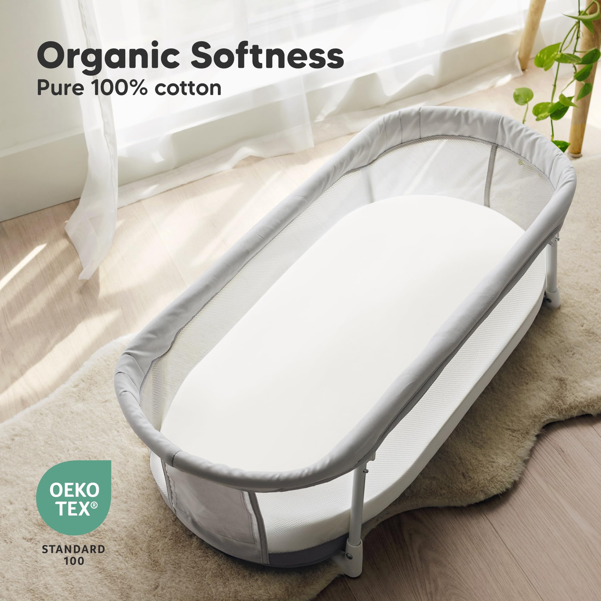 2-Pack Bassinet Sheets Organic Cotton – KeaBabies Soothe Bassinet Mattress Sheets, sized at 33" x 17" with a depth of up to 4", provide a universal fit for all bassinet mattress pad types. They can be used as oval and rectangle bassinet sheets.