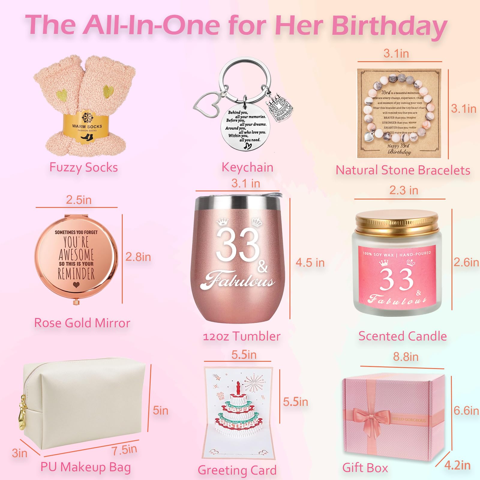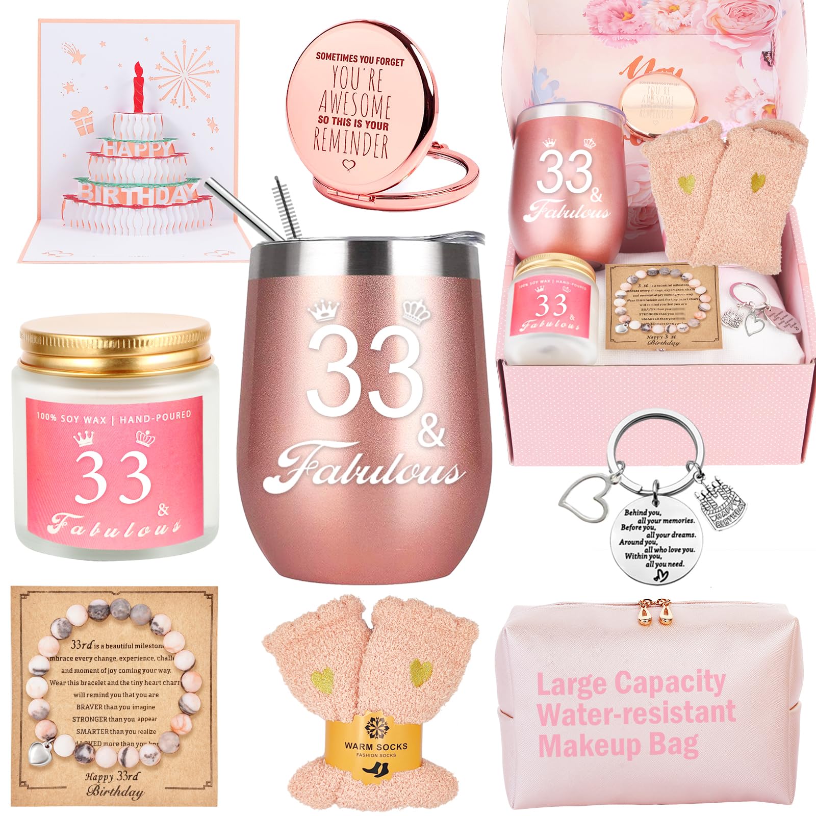 【Best Friends Gifts Box For Girls Women】 Imagine the surprise of receiving this gift on her 33rd birthday. She can use candle to make her feel smoothing and is great for sleep-promoting, enjoy the happiness of making up with rose gold mirror and makeup bag and have a morning coffee or afternoon drink with her new favorite wine tumbler. A good day starts with your birthday gifts!