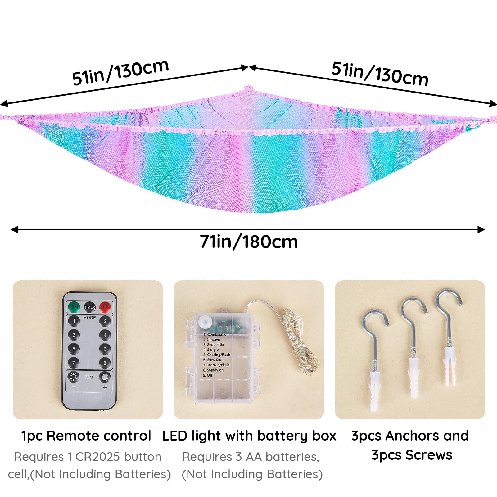 Package Included: 1pcs stuffed animal hammock, 1pcs 118 inches LED string light with battery box; Batteries not included; 3 pcs wall hooks for installation