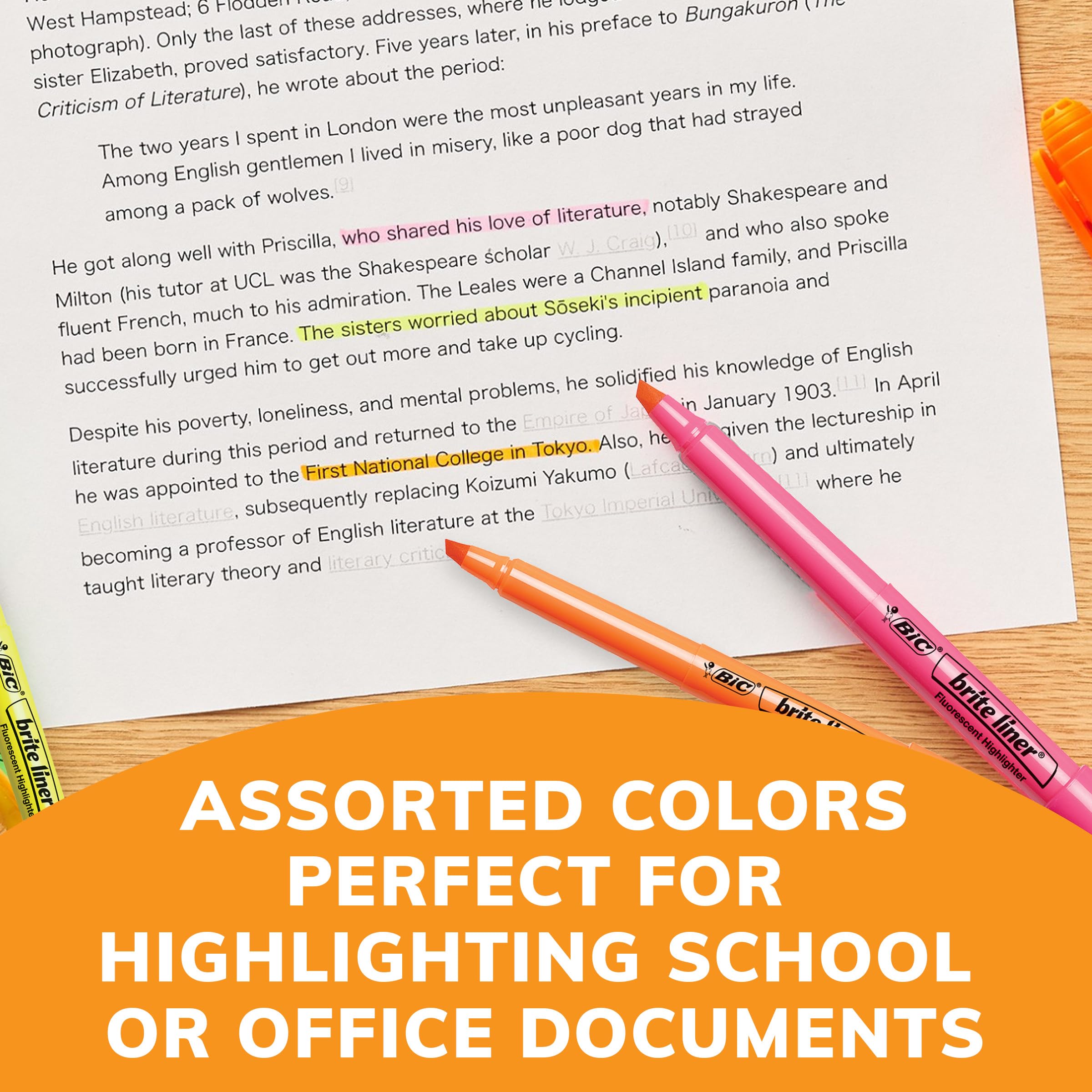 Make organization fun and easy with the BIC Brite Liner Pink Highlighter Set. These highlighters have a chisel tip for broad highlighting or fine underlining, making them perfect for highlighting school or office documents. BIC's highlighter markers use translucent ink to emphasize what's important on the page without obscuring the text below. Reliable and long-lasting, each BIC Brite Liner highlighter writes for up to eight hours without a cap and does not dry out, so you can work with confidence. The convenient pen-shaped design lets you easily grip and comfortably use the highlighters chisel tip to organize your notes or underline passages in textbooks, notebooks and documents. Looking for classic highlighters for journals or pink marker sets for adults? BIC Brite Liner Pink Highlighters add a fun pop of color to your art, office or school supplies. Each pack contains 12 pink chisel tip highlighter markers. BIC highlighters are ACMI-approved for a high-quality, safe product you can trust. Whether you're emphasizing text or just feel like getting creative, choose BIC Brite Liner Highlighters.