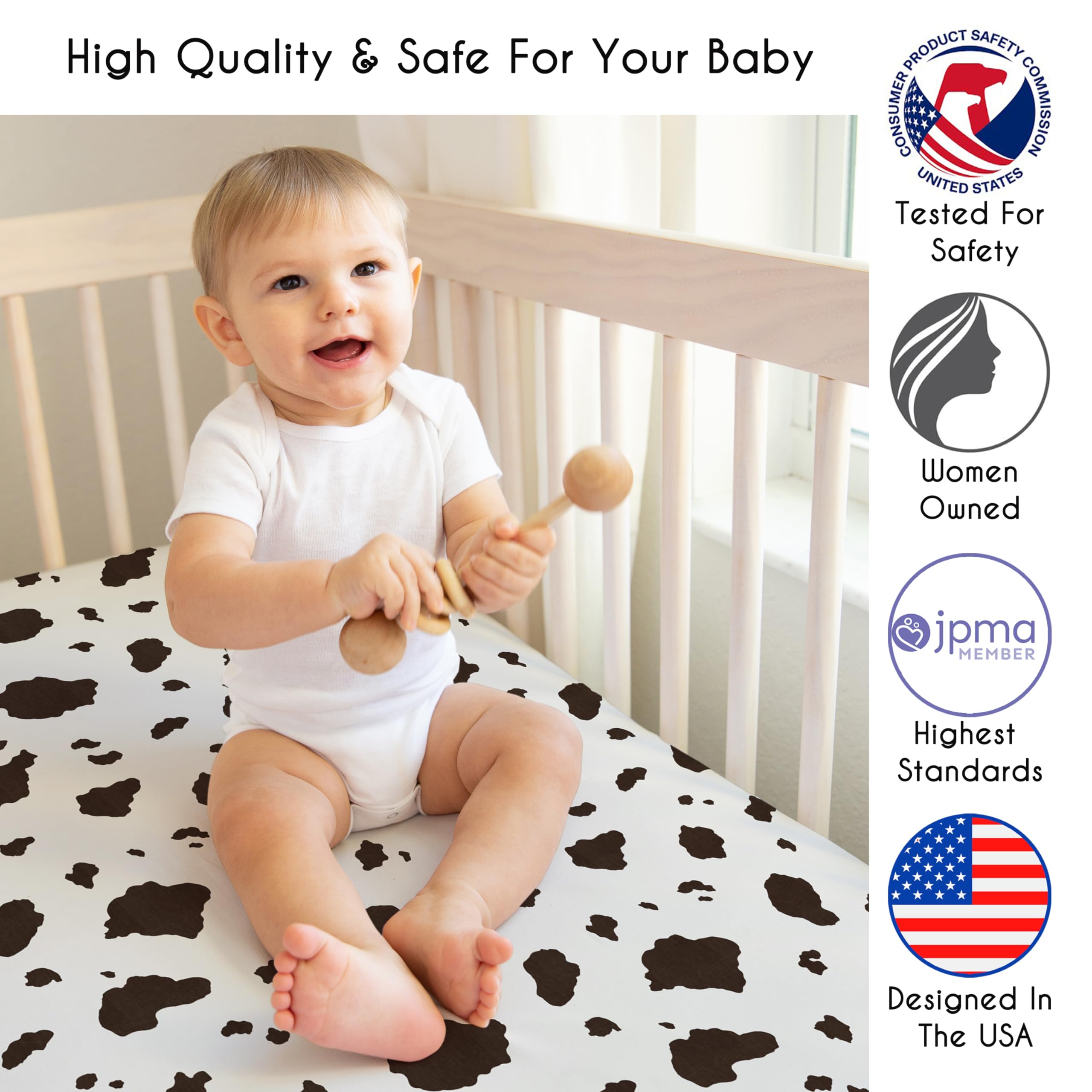 SNUG FIT: Includes (1) Fitted Crib Sheet 52in. x 28in. x 8in. Our newborn standard crib sheets fit snugly, with premium elastic sewn around the entire bottom edge for a secure fit on most standard sized cribs and toddler beds, to reduce shifting & bunching. This brushed microfiber crib sheet features an exclusive design of a chocolate brown and cream off white cow print for the western cowboy, southern, Wild West Collection and is gentle on delicate skin to foster a soothing sleep environment.