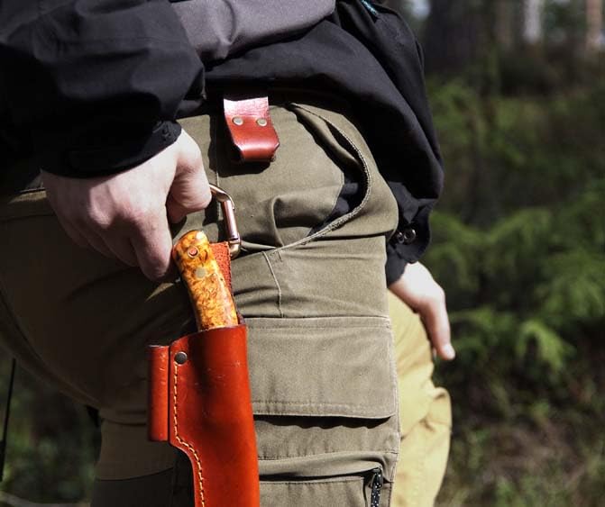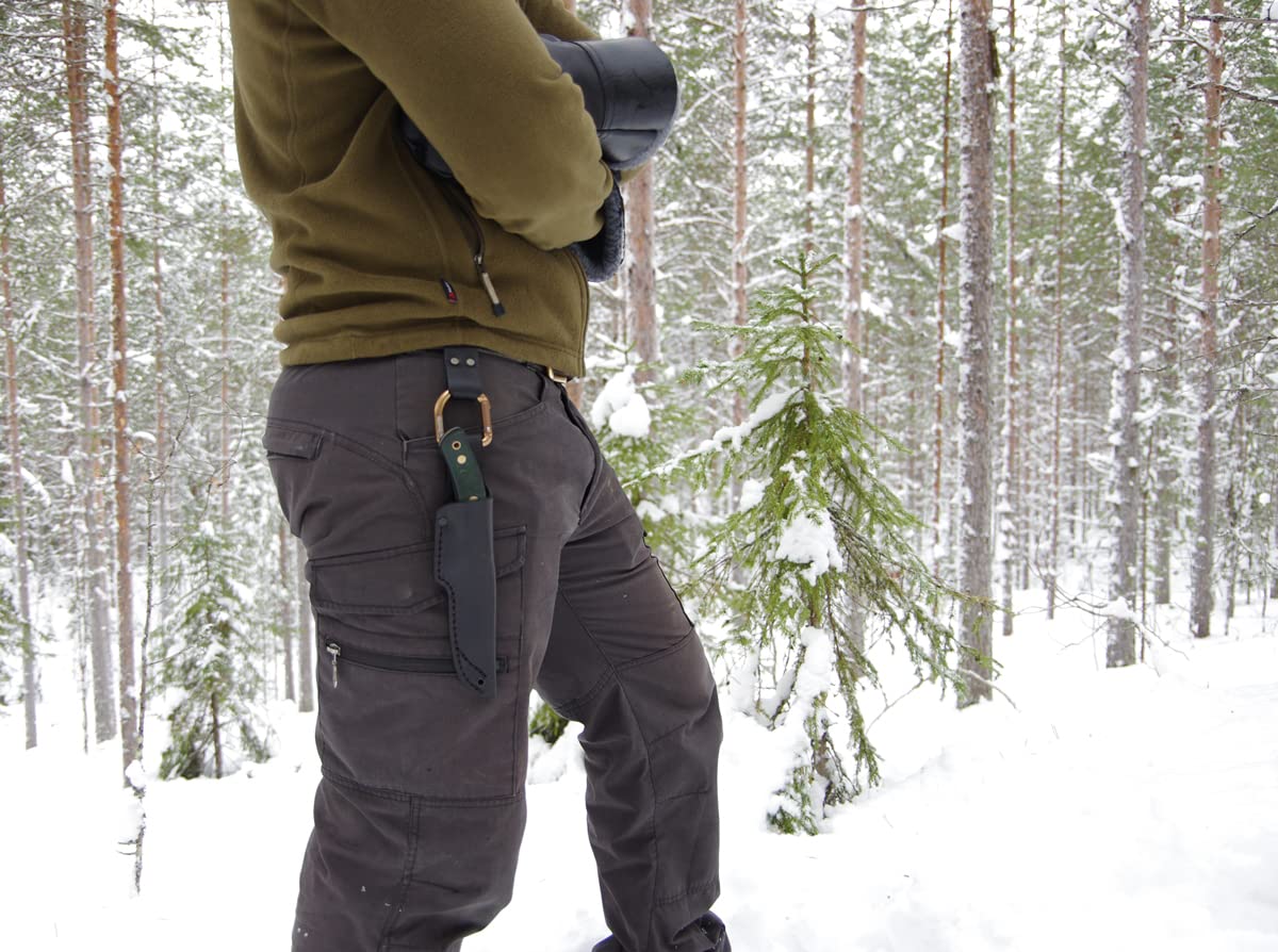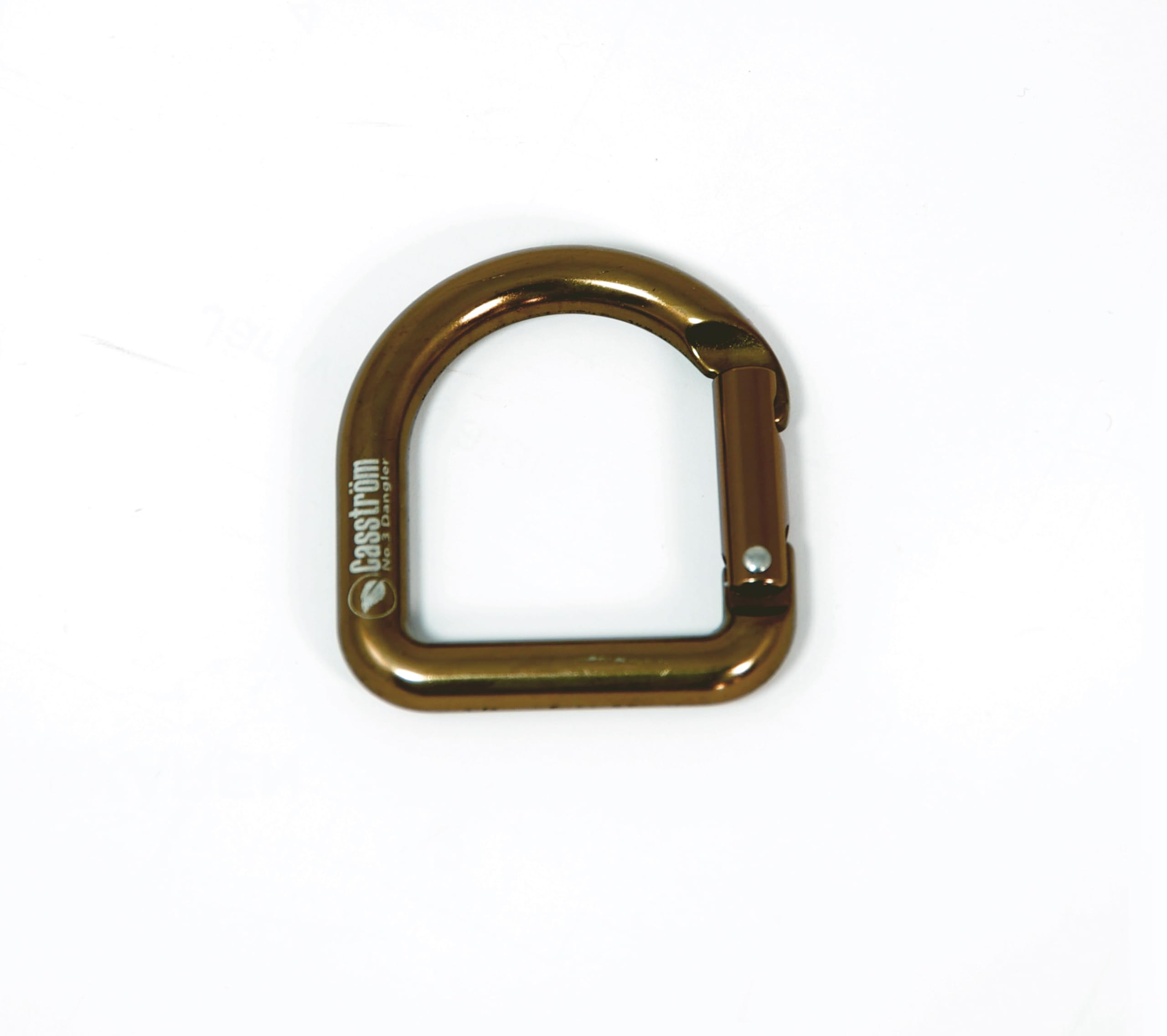 Casström's No.3 Dangler is an ingenius accessory to let your knife hang further down from the waist, dangle freely so that you can move easily and make handling on and off the belt smoother. The specially designed D-ring carabiner can also be used for other tasks. Many of our customers have requested an extended belt loop, a "dangler" so that the knife can be easily accessed even when you have a jacket on or a large backpack with a hip belt. With a Dangler it also becomes easy to sit down without the knife getting in the way. When the pouch or sheath hangs it can be bent at the height of the hip joint which allows the knife to smoothly follow your legs movement - you can run, climb and bend almost without noticing the knife. We have also designed the D-ring as a carabiner and thus opened up many new features and applications. You can easily take the knife off without having to open your belt, you can easily move the knife to your backpack for example, or just quickly take it off if you are approaching a populated area. The D-ring is made of sturdy 8mm thick aluminum and in tests the breaking strength has exeeded 400kg which means that you can use it for lots of different purposes, for example to hang up the equipment, pull an animal or anchor a dog leash to your waist. It can also be used for suspending a tarp or hammocks. Note that the D-ring should not be used for climbing since a bad fall can create forces that exceed 400kg even if the person is not heavy. The belt loop is made of sturdy 3mm thick vegetable tanned cowhide available in Cognac Brown, Black or Dark brown. The loop can take belts with a width up to 2 1/4". The Dangler's D-ring will take knife sheaths with a belt loop up to 1 3/8" wide.