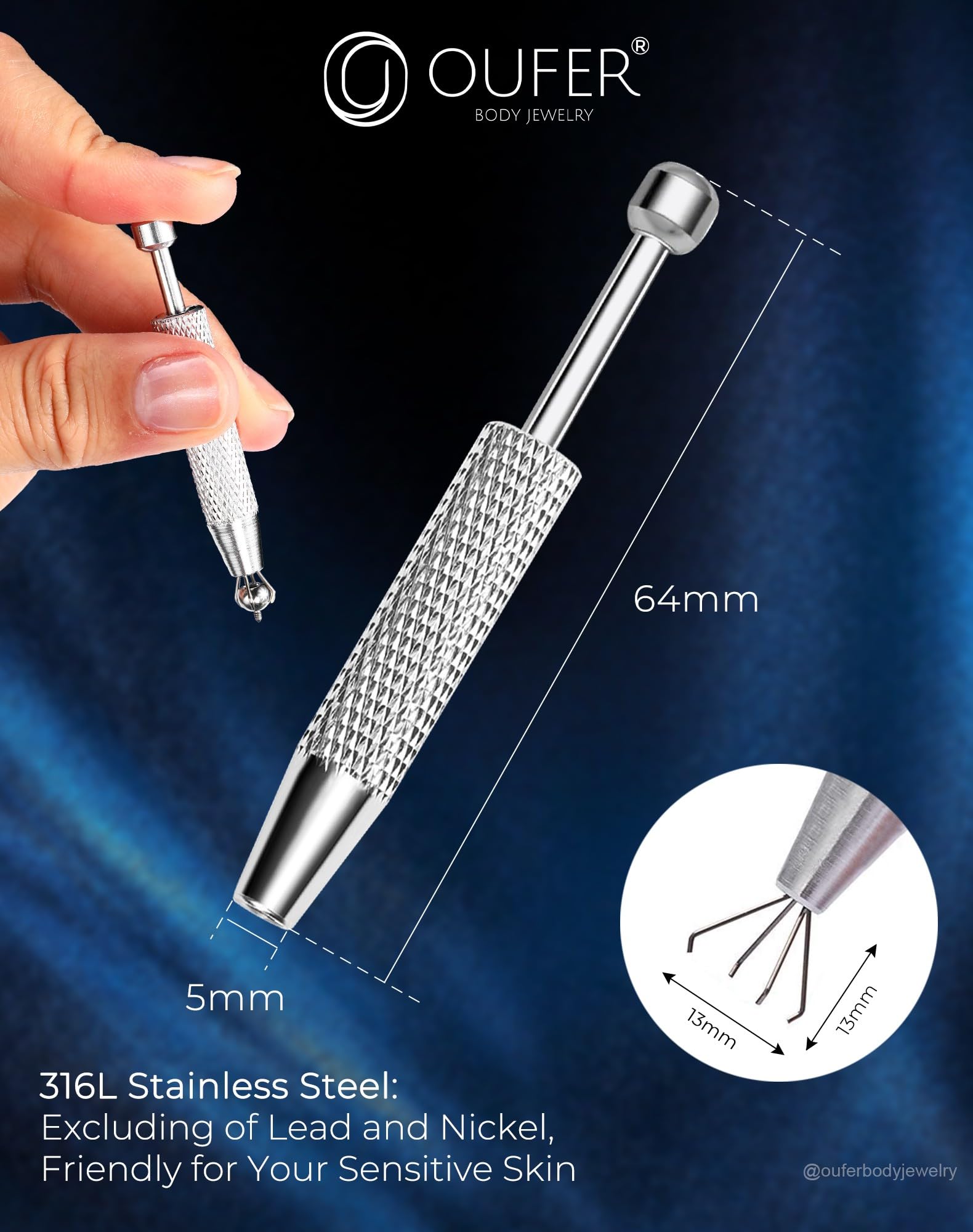 [Material] The Piercing Ball Grabber Reacher Tool is crafted from durable 316l stainless steel, ensuring long-lasting use. This material choice means it can withstand frequent handling and cleaning, making it a reliable grabber reacher tool for changing piercing jewelry.