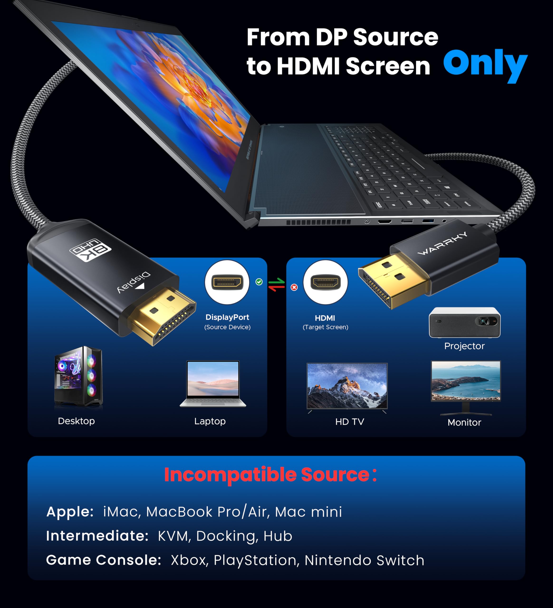 [Universal Compatibility] This DP to HDMI cable seamlessly connects desktop PCs, laptops, GPUs (AMD), and any other device equipped with a DisplayPort to TVs, projectors, monitors, VR headsets, and more. *Note: this 8K displayport to hdmi cable is a ONE-WAY cable, specifically designed to convert from DisplayPort sources to HDMI displays.