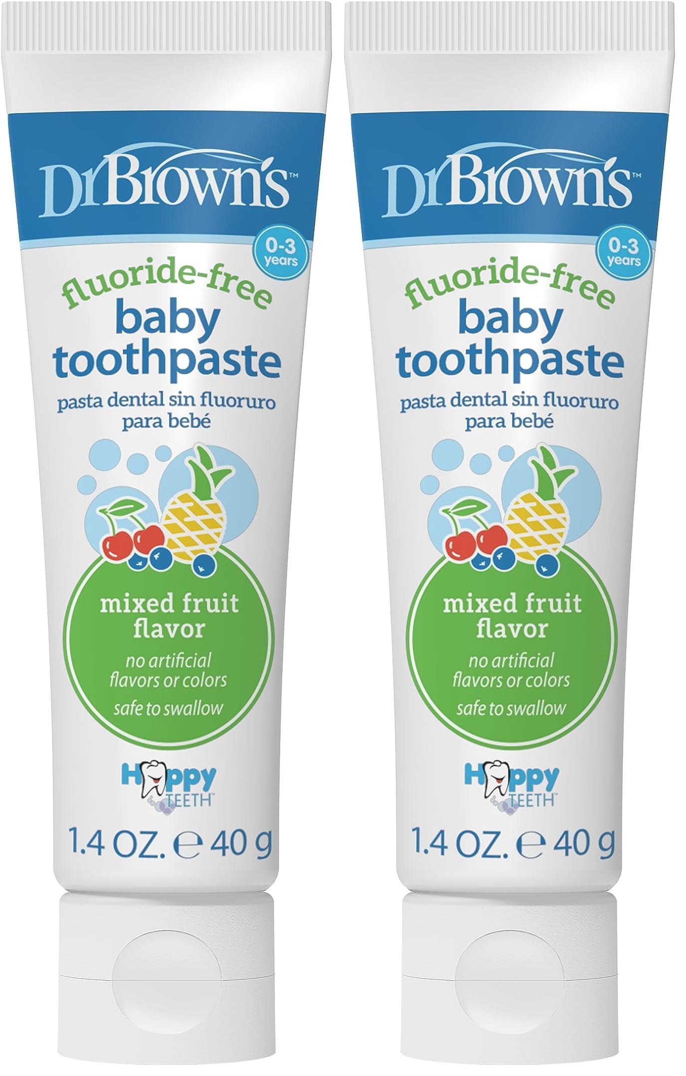 Dr. Brown’s Fluoride-Free Baby Toothpaste safely and effectively cleans baby’s teeth and gums with no fluoride, artificial flavors, or colors. This fluoride-free training toothpaste is the perfect first step for little ones to learn healthy oral hygiene habits, and the tasty flavors will make them want to brush! Start building the skills baby needs to learn independent brushing. Just add a pea-sized drop to a super-soft bristled toothbrush and use small circular motions to gently clean their teeth and gums. Contains xylitol, a natural sugar alcohol known for its dental benefits such as reducing the risk of tooth decay and gum disease, and reducing plaque formation. Free from fluoride, SLS, gluten, phthalates, or parabens. Always use with adult supervision. Keep away from dogs. 1.4oz/40g. 0-3 years.