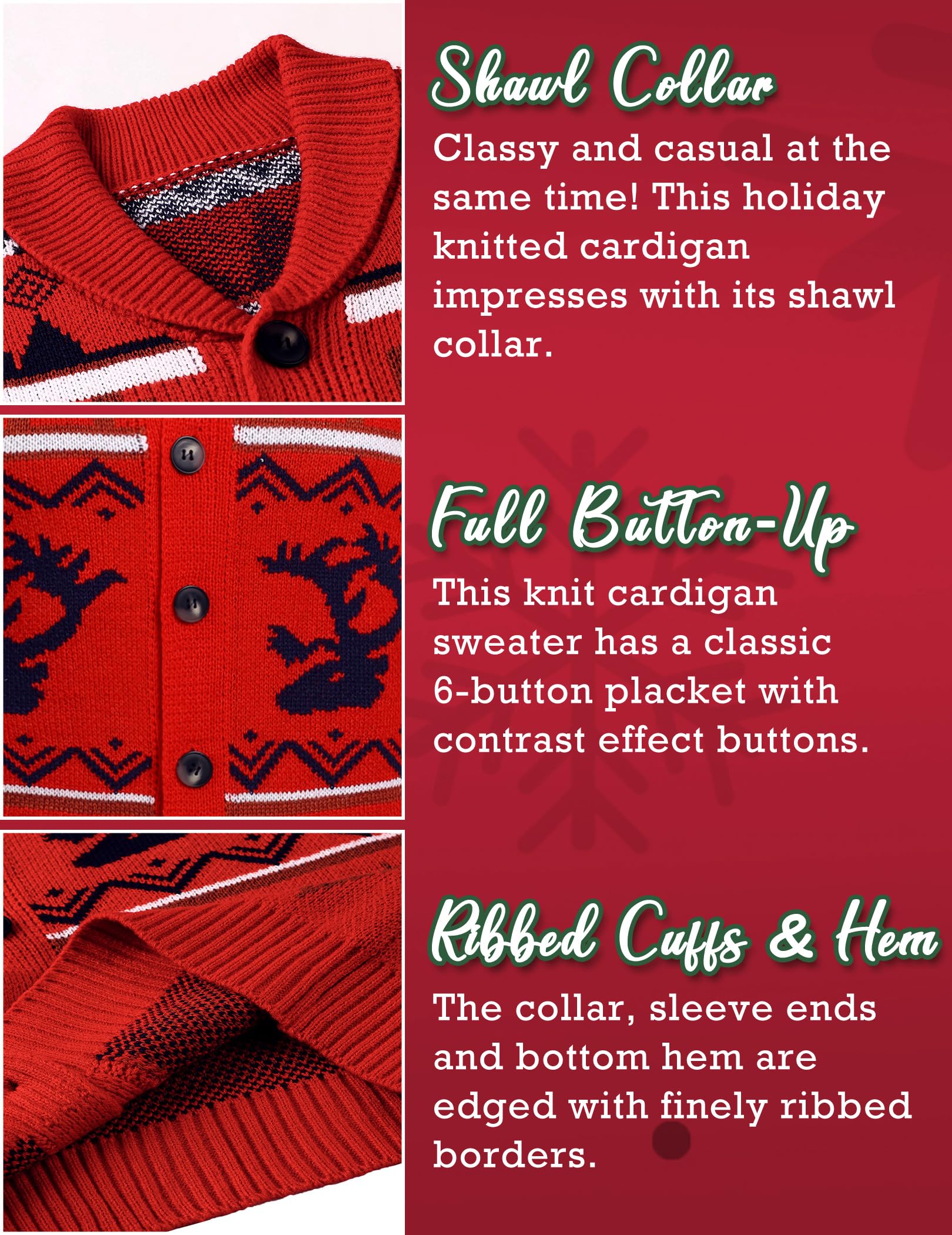 CHARMING CHRISTMAS PATTERN - This Xmas knit cardigan boasts a charming Christmas motif. The Reindeer & Snowflake pattern on this cardigan brings on that festive feeling and is sure to get you in the Christmas spirit.