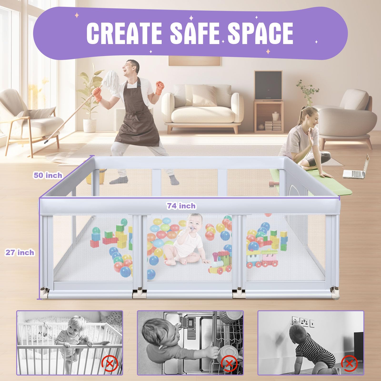 ENOUGH SPACE PLAY AREA:Our 74x50x27 inch play pen can accommodate 4 babies and an adult to play at the same time, the small play yard is easy to move and can be placed anywhere. Scientific height, Scientifically tall enough for toddlers 6 months to 6 years to help them stand and walk. (Note: Mat not included)