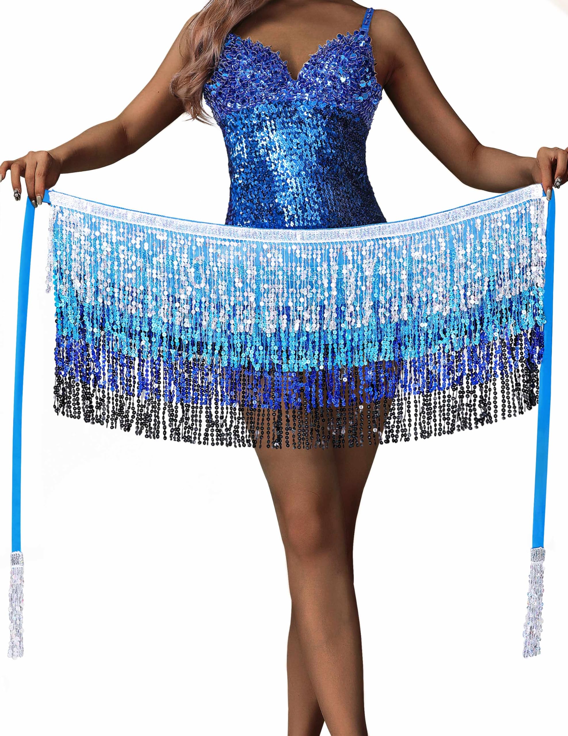 ONE SIZE FITS MOST: The tassle skirt is designed of lacing belt, which allows you to adjust the length of the belt to suit your waistline. The skirt width of belly dancer skirt is about 30.7'', and the waistline of the sequince skirt can be adjusted approximately from 30.7'' to 74.8". The fringe length is 13'', the length of each belt is 22.05'', the length of belt tassel is 5''. As the waist circumference increases, the slit of the skirt will also widen to accommodate different body shapes.