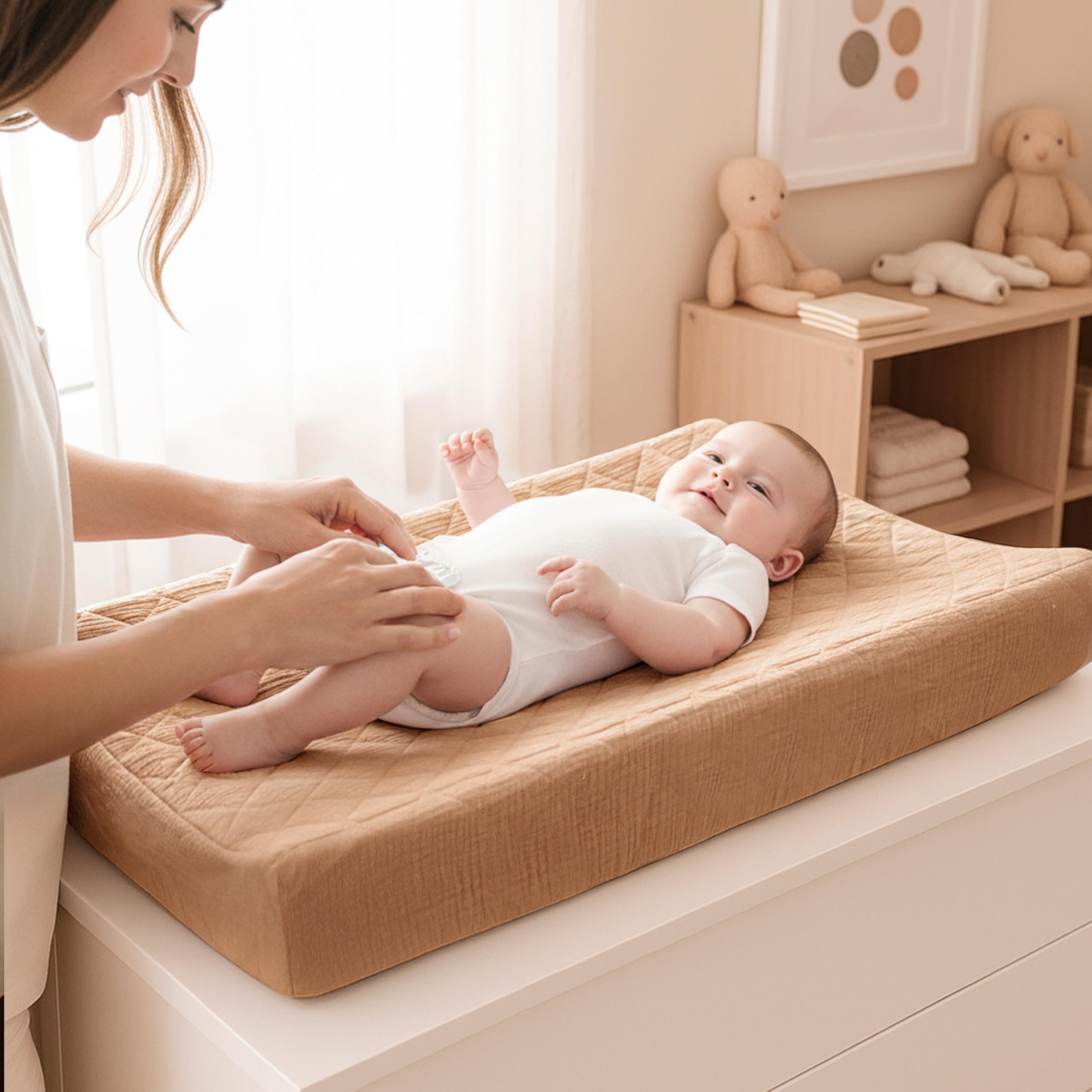 Quilted and Soft Fabric: Our changing pad cover consists of three layers: the top layer is made of 100% cotton (muslin), which is soft and absorbent; the middle layer is quilted with soft padding to ensure coziness and comfort; and the bottom layer is made of 100% waterproof polyester to protect the pad from wetting. Our unique design provides a comfortable touch for your baby while ensuring waterproof functionality, making our changing pad soft and perfect for delicate baby skin.