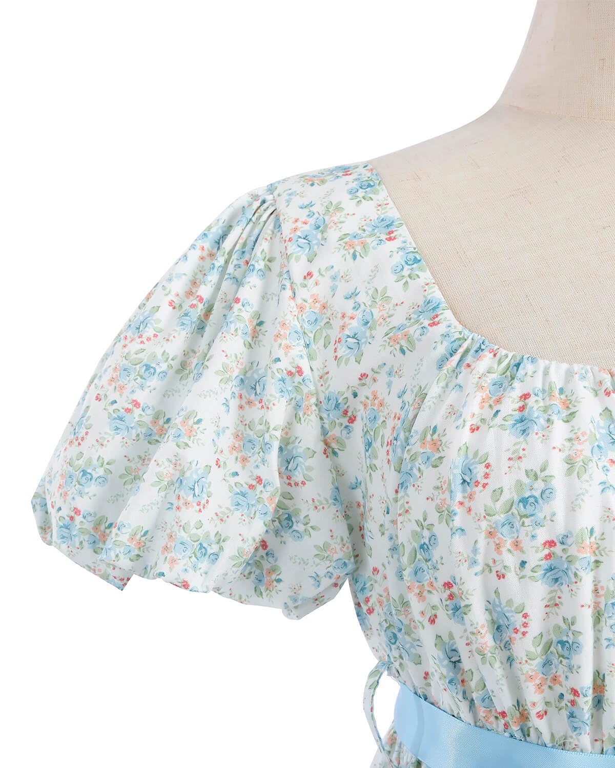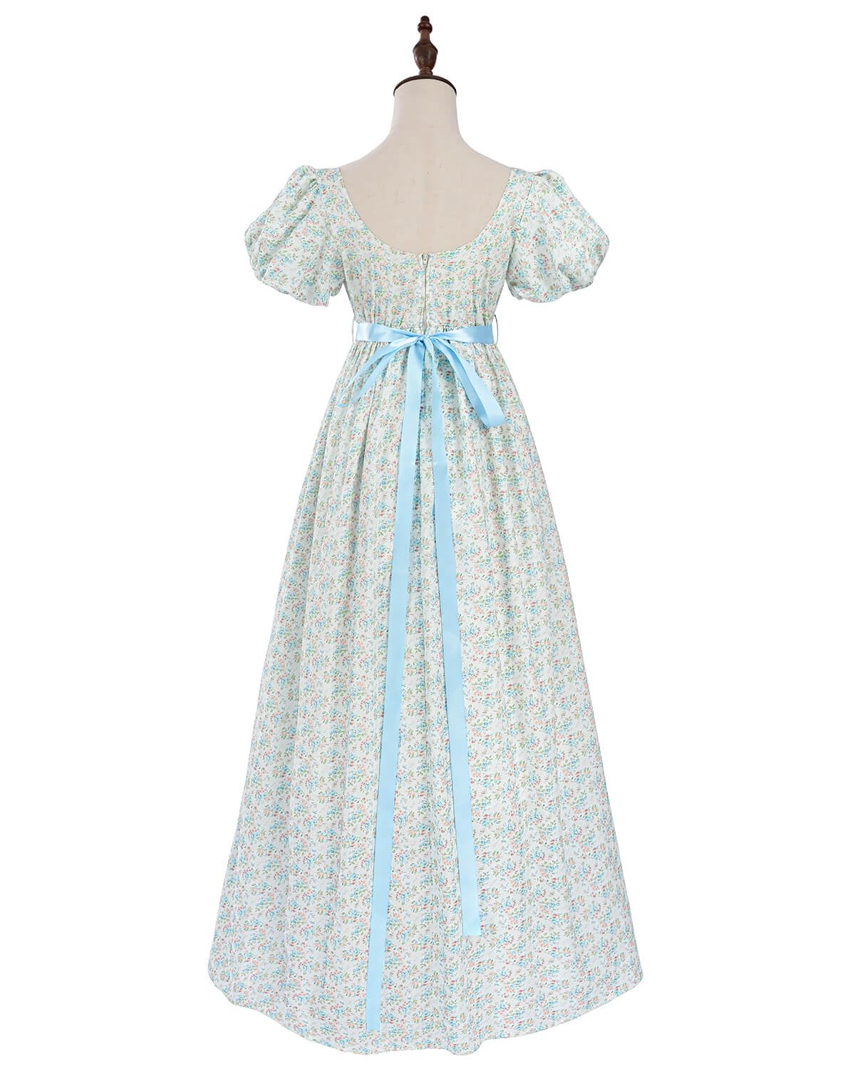 Authentic 1800s Regency Look - This regency dress for women features a low, spoon neckline, elastic puffy sleeves, U-Back and and a flattering Empire waist trimed with blue satin ribbon. Easy to put on and off.