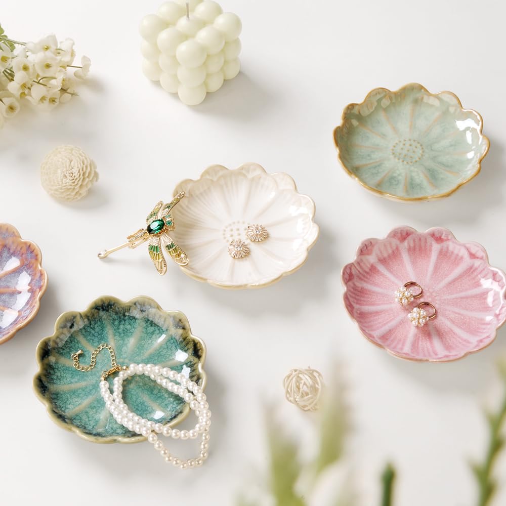 All Jewelries Are NOT Included. Jewelry Bowl Dimensions: 4.3″×4.3″×0.8″ Material: High Quality Ceramic Color: Weight: About 152g Shape: Lotus; Technology: Kiln process.